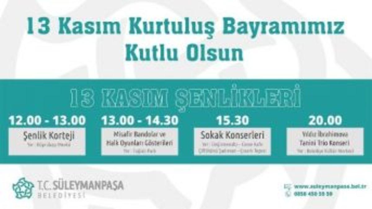 Tekirdağ merkez ilçe Süleymanpaşa’nın kurtuluşu dolayısıyla 13 Kasım Perşembe günü resmi kutlama programının dışında Süleymanpaşa Belediyesi tarafından bir dizi etkinlik gerçekleştirilecek.13 Kasım Perşembe günü Köprübaşı mevkiinden kortej yürüyüşü ile başlayacak etkinlikler gün boyu sürerken Süleymanpaşa’nın kurtuluşu coşkusu Yıldız İbrahimova ve Tanini Trio konseri son bulacak. Süleymanpaşa halkını bütünleştirmeyi amaçlayan kurtuluş etkinlikleri çerçevesinde gerçekleştirilecek kortej yürüyüşüne Edirne Belediye Bandosu, Babaeski Belediye Bandosu, Silivri Belediye Bandosu, 5. Kolordu Bandosu, sivil toplum kuruluşları, spor kulüpleri, taraftar grupları, meslek örgütleri, hemşehri dernekleri ile Kocaeli, Eskişehir ve Kütahya’dan gelecek halk oyunları ekipleri katılacak.Tuğlalı Park’ta son bulacak kortej yürüyüşü sonrası misafir bando ve halk oyunları ekipleri Tuğlalı Park’ta gösterilerini gerçekleştirecek. Sokak konserlerinde halk oyunları ve bando ekipleri Değirmenaltı Mahallesi, Çınarlı Mahallesi ve Çiftlikönü Mahallesi’nde eş zamanlı olarak sahne alacak.13 Kasım Süleymanpaşa’nın kurtuluş etkinliklerinin sonunda ise dünyaca ünlü Türk asıllı Bulgar caz müziği sanatçısı Yıldız İbrahimova ile Tahir Aydoğdu, Bilgin Canaz ve Hakan Ali Toker’den oluşan Tanini Trio müzik grubu Belediye Kültür Merkezinde konser verecek.