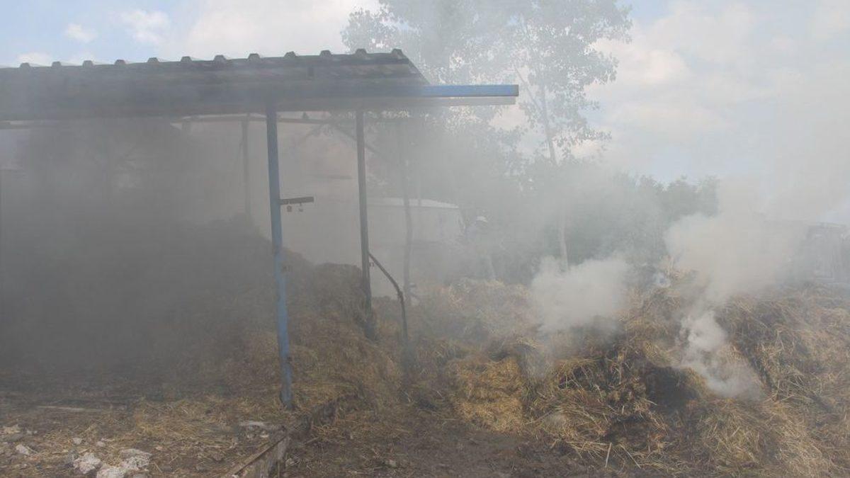 Sakarya'nın Kaynarca ilçesinde kaynak yapımı sırasında sıçrayan kıvılcımların neden olduğu yangında 650 saman balyası yandı.
