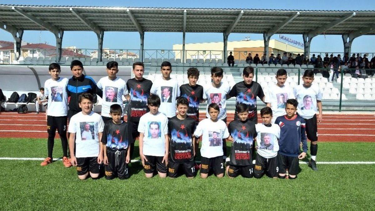 Kahramankazan Ortaokulu öğrencileri, ilçede düzenlenen futbol turnuvasında ilk maçına 15 Temmuz şehitlerinin resimlerinin olduğu formalarla...