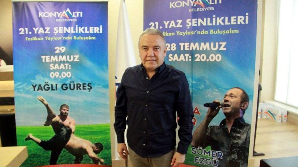 Konyaaltı Belediye Başkanı Muhittin Böcek 21. Feslikan Yaylası Yaz Şenlikleri’nde Sümer Ezgü ve Funda Arar’ın konser vereceğini belirterek, Kırkpınar’ı yaşatacaklarını söyledi.Konyaaltı Belediyesi’nde 21.Feslikan Yaylası Yaz Şenliklerinin basın toplantısı düzenlendi. Konyaaltı Belediye Başkanı Muhittin Böcek, Antalyalıların 21.Feslikan Yaylası Yaz Şenlikleriyle heyecanı ve coşkuyu bir arada yaşayacaklarını belirtti. Feslikan Yaylası’nın bin 800 metre yüksekliğe sahip olduğunu ifade eden Böcek, yaz şenlikleri için gerekli bütün çalışmaların tamamlandığını kaydetti.Ünlü iki isim sahne alacakBu yılda binlerce ziyaretçiyi Feslikan Yaylası’nda ağırlayacaklarını dile getiren Böcek, “28 Temmuz Cumartesi günü saat 20.00’de ‘Torosların Oğlu’ Sümer Ezgü ve Türk pop müziğinin önde gelen isimlerinden Funda Arar Antalyalılarla buluşacak” dedi.800 pehlivan güreşecek29 Temmuz Pazar günü ise 800 pehlivanının yağlı güreşlerde kol bağlayacağını söyleyen Böcek, Konyaaltı Belediyesi’nin 656. Tarihi Kırkpınar Başpehlivanı İsmail Balaban’ın da güreşeceğini vurguladı.“Feslikan’da da Kırkpınar yaşatacağız”657. Tarihi Kırkpınar Yağlı Güreşleri’nde gönlünden geçen ismin İsmail Balaban olduğunu söyleyen Başkan Böcek, yine de Kemer’in Antalya’ya gelmiş olmasının gurur verdiğini kaydetti. Siyasetle sporu asla birbirine karıştırmadıklarını ifade eden Böcek, “İsmail Balaban başpehlivanımız olduğunda sayın cumhurbaşkanımız başta olmak üzere herkes tebrik etmiştir. Orhan Okulu’da benim çok sevdiğim kardeşimdir. Antalya’ya gelmesi gurur vericidir. Feslikan’da da Kırkpınar yaşatacağız” diye konuştu.