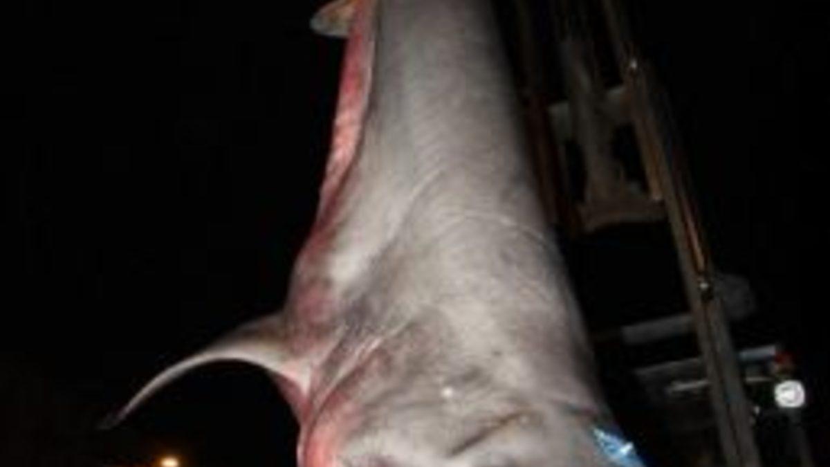 Bursa'nın Karacabey ilçesi Kurşunlu Boğazı'nda yakalanan 3 metre 23 santimetre boyunda, 372 kilogram ağırlığındaki köpekbalığına çocuklar büyük ilgi gösterdi.Kurşunlu Boğazı'nda yakalanan 3 metre 23 santimetre boyunda, 372 kilogram ağırlığındaki dev köpekbalığını görenler vatandaşlar köpekbalığına büyük ilgi gösterdi. İlk defa köpek balığı gören çocuklar korkmadan köpek balığını dokunarak inceledi. Forklifte asılan ve pazartesi gününe kadar sergilenecek köpekbalığı, bin 500 liraya Çanakkale'de bir otele satıldı. Vatandaşlar ilk defa gördükleri köpekbalığıyla resim çekinmek için sıraya girdi.Köpekbalığını gece saat 01.00 civarında Karacabey Kurşunlu Boğazı'nda yakaladıklarını belirten İşletme Sahibi Ömer Kocaman, köpekbalığının karadan 18 mil açıkta sardalya ağlarına takıldığını söyledi. Kocaman, "Köpekbalığı Eti yenilebilecek camgöz cinsi. Çanakkale'de bir otele bin 500 TL karşılığında sattık. Pazartesiye kadar sergileyeceğiz. İsteyen arkadaşlar da oldu ama Çanakkale'ye gidecek” dedi.İlk defa bu kadar büyük köpek balığı gördüklerini söyleyen vatandaşlar köpek balığını uzun süre inceledi.