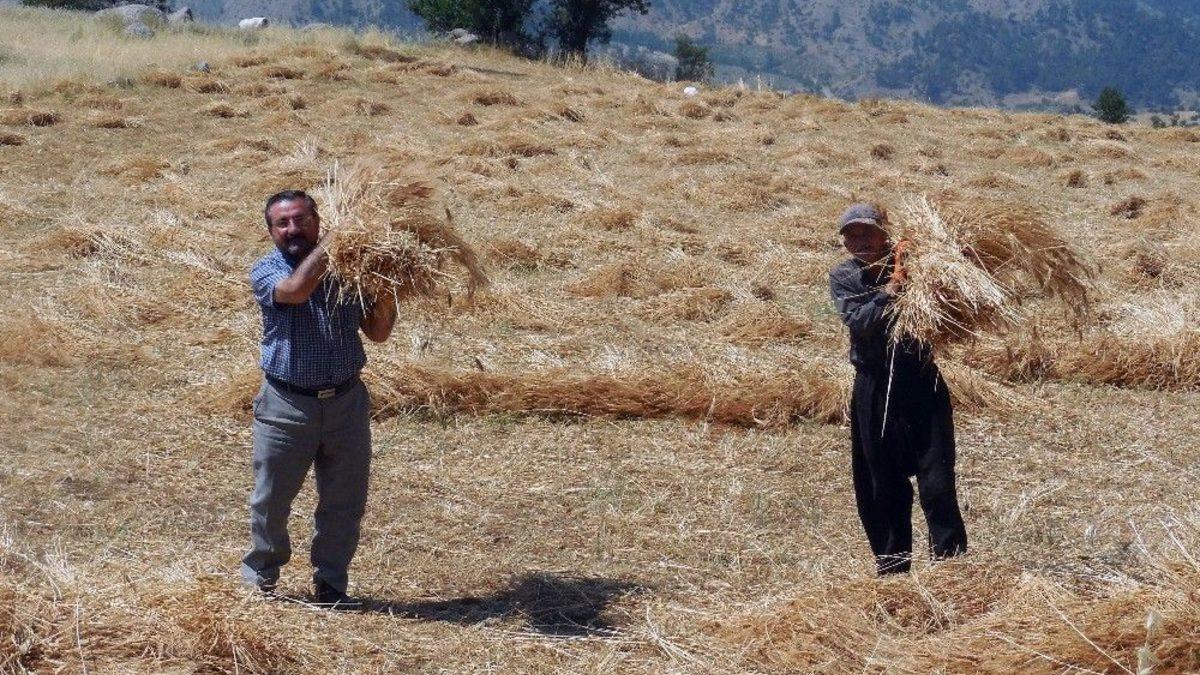 Kahramanmaraş’ta çiftçiler, 41 derece sıcağın altında geleneksel yöntemlerle buğday hasadı yapıyor.Onikişubat ilçesine bağlı Hacıbudak Mahallesi’nde engebeli ve dağlık arazide tarım aletlerinden tam olarak faydalanamayan çiftçiler, ürünlerin hasadını insan gücüyle yapıyor.Makine desteğinin çok az olduğu mahallerinde hasat dönemi hakkında bilgi veren Sarıgüzel Mahalle Muhtarı İsmail Yıldız, “Buraya biçerdöver girmediği ve arazi şartlarının uygun olmadığı için, eski yöntemleri kullanıyoruz. İnsan gücüyle alınan ürünler sayesinde vatandaşlarımız kışlık erzak ihtiyaçlarını gideriyorlar” dedi.Bereketli bir hasat dönemi geçirdiklerini belirten üreticilerden Muhammet Mustafa Doğru ise “3 bin 50 rakımlı olan Berit Dağı’nın eteklerinde kurulu olan Hacı Budak Mahallemizdeyiz. Burada eski usul ile hasat yapılıyor. Buğdaylar çıkartılıyor. Buralara biçerdöver gelemiyor. Maşallah bu yıl çok bereketli hasat elde edildi. Şükürler olsun” diye konuştu.
