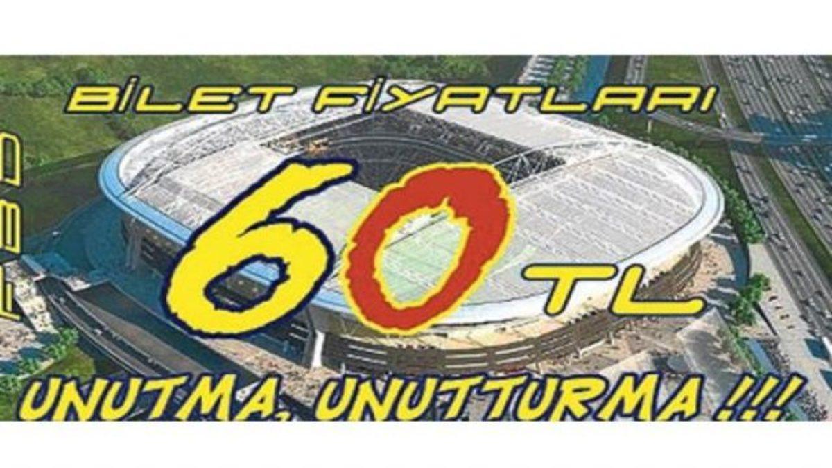 Galatasaray Kulübü'nün, Türk Telekom Arena'da cuma akşamı oynanacak derbide, Fenerbahçeli misafir taraftarlar için ayrılan kale arkası tribün biletlerinin fiyatını 60 lira olarak tespit etmesi espri konusu oldu.