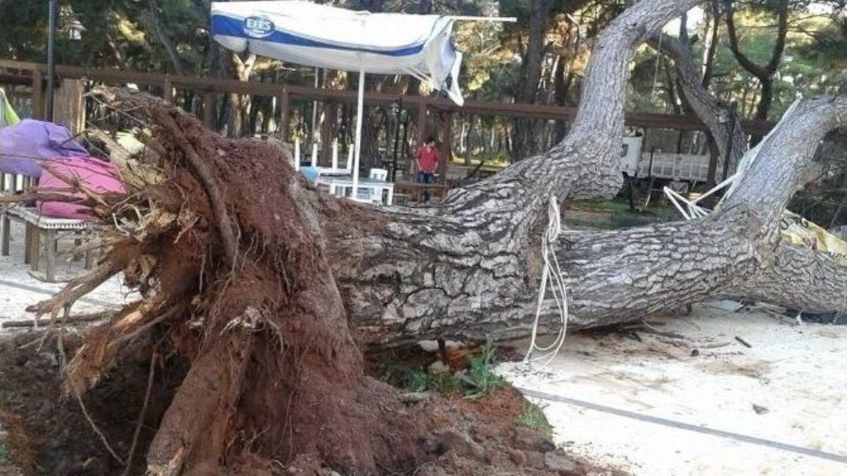 Antalya’nın Döşemealtı ilçesindeki mesire alanında 70 yıllık dört ton ağırlığındaki çam ağacı devrildi. Olayda ölen ya da yaralanan olmazken 10 bin TL’lik maddi zarar olduğu bildirildi.Döşemealtı ilçesi Düzlerçamı mesire alanında bulunan 70 yıllık çam ağacı, saat 21:00 sıralarında büyük bir gürültüyle devrildi. Ağacın yıkıldığını gören mesire alanındaki vatandaşlar ve işletme sahipleri olay yerine geldi. Ağacın topraktan kökleriyle birlikte çıkıp devrildiğini görünce büyük şaşkınlık yaşandı. Ağacın devrildiği saatlerde şans eseri alanda kimsenin olmaması bir faciayı önledi.Yaşanan olayın yetkililere haber verilmesi üzerine ağaç bulunduğu yerden kaldırılırken bir işletme sahibi ağacın yıkılması sırasında yaklaşık 10 bin TL maddi zarar olduğunu belirtti.