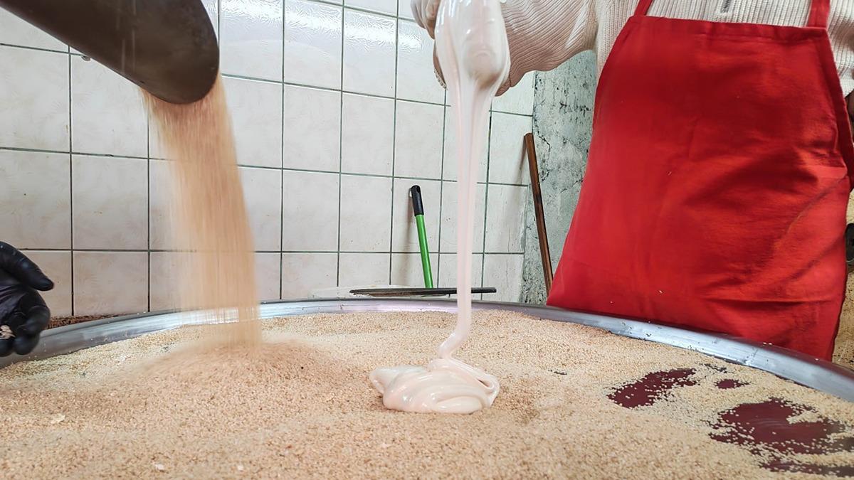 İçerisinde glikoz veya yapay tatlandırıcı bulunmayan helva; su, şeker, limon suyu ve çöven otunun ateşte kaynatılmasıyla hazırlanan ağdanın, tahta kepçelerle kıvam alması ve çifte kavrulmuş susamla buluşmasıyla üretiliyor.