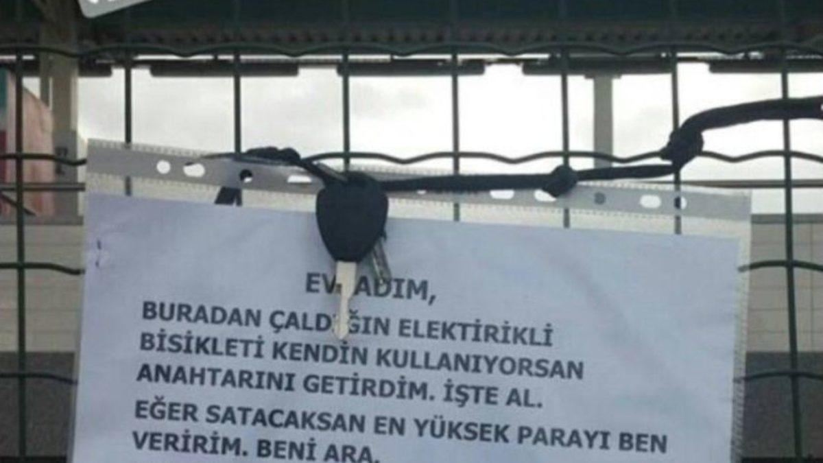 Bursa’da, elektrikli bisikletli çalınan yaşlı adam, hırsıza notla beraber bisikletinin anahtarını da bıraktı.Nilüfer’in Ertuğrul Mahallesi’nde oturan 80 yaşındaki bir vatandaşın elektrikli bisikleti geçen hafta çalındı. Her yere elektrikli bisikleti ile giden yaşlı adam, hırsızlara bir not ile bisikletin anahtarını bıraktı. Yaşlı adam, astığı pusulaya, “Evladım, buradan çaldığın elektrikli bisikleti kendin kullanıyorsan anahtarını getirdim, işte al. Eğer satacaksan en yüksek parayı ben veririm, ara beni. Çünkü 80 yaşımda beni elden ayaktan düşürdün” diye sitem dolu satılra yazdı.Hırsızlar için yazılan not kısa sürede sosyal medyada birçok kullanıcı tarafından paylaşılırken, polis ekipleri bisikleti bulmak için çalışmalarına devam ediyor.