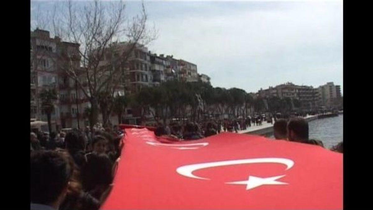 Çanakkale Gençlik Grubu ve MHP İl Teşkilatı tarafından Çanakkale Deniz Zaferinin 98. yılı münasebetiyle yaptırılan 98 metrelik dev bayrağın altında şehitlere saygı yürüyüşü yapıldı. Yürüyüşe Milliyetçi Hareket Partisi Merkez İlçe Başkanı İbrahim Tayfun Uğur da katıldı. “Mustafa Kemal’in askerleriyiz”, “Şehitler ölmez, vatan bölünmez” sloganlarıyla iskeleye kadar yürüyen vatandaşlar saygı duruşunda bulundu. İstiklal Marşının okunmasının ardından yürüyüş sona erdi.