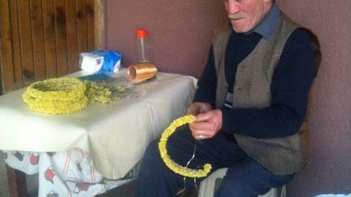 Bolu’da bulunan Abant Tabiat Parkı’nda 30 yıldır kendi elleriyle yaptığı çiçekleri satarak para kazanan Mustafa Kor (69), tatilciler için yeni ürünlere hız verdi.