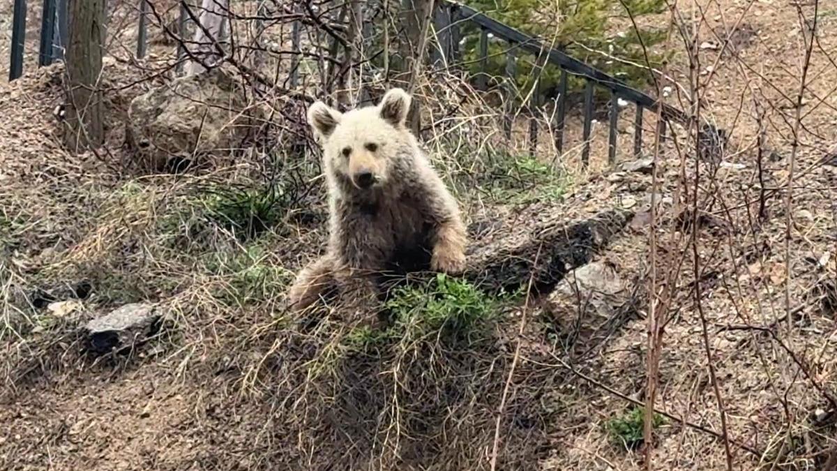 Gümüşhane'nin merkez ilçesine bağlı Kale köyünde annesinin terk ettiği değerlendirilen ve köy merkezine kadar inen yavru bir ayı, sakin hareketleriyle dikkat çekti.