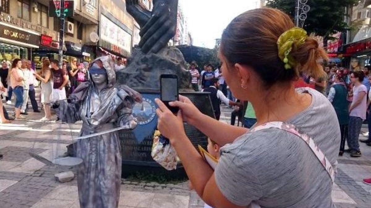 Daha önce de aynı yerde ‘Matmazel’,’ madenci eşi’, ‘Kemancı kız’, ‘Çanakkale Savaşı’na katılan Mehmetçiğin eşi’, ‘Sihirbaz’, ‘Temizlik işçisi’, ‘Demokrasi nöbetçisi’ gibi karakterlerin ‘Heykel duruşları’na ilişkin performans sergilediğini anlatın Aleyna Çevik, “Canlandırdığım adaleti simgeleyen tanrıça ‘Themis’in gözü kördür, terazinin kefesi hangi yöne ağır gelirse yönde karar verir. Adaletin kılıcı keskindir. Ama maalesef ülkemizde ve dünyada böyle olmuyor. Adalet yerini bulmuyor. Masum insanlar tutuklanıyor, canından oluyor. Sanatçı olarak duyarlılık göstermemiz, insanları duyarlılığa davet etmemiz gerek. Bugün adalet adına büyük bir yürüyüş yapılıyor. Adalet kişi ayrımı yapmadan herkese, her zaman lazım” dedi.