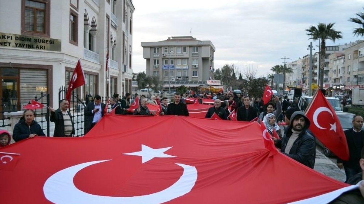 Aydın’ın Didim ilçesinde Afrin’de devam eden Zeytin Dalı Harekatı’nda terör örgütüyle mücadele eden Mehmetçiklere destek olmak ve şehit askerleri anmak için bayrak yürüyüşü düzenlendi.Suriye’nin Afrin bölgesinde devam eden Zeytin Dalı Harekatı’nda görev yapan Mehmetçiğe moral vermek ve şehit askerleri anmak amacıyla Didim’de 75 Gençlik Derneği ’bayrak’ yürüyüşü düzenlendi. Merkez Camisi önünde başlayan yürüyüşe Didim Kaymakamı Mehmet Türköz, Didim İlçe Emniyet Müdürü Serkan Demircioğlu, Didim İlçe Jandarma Komutanı Gürkan Kabakçı, siyasi parti ve meslek örgütleri temsilcileriyle bine yakın vatandaş katıldı. Açılan dev Türk bayrakları ve marşlar eşliğinde gerçekleşen yürüyüş, Cumhuriyet Caddesi ve Atatürk bulvarı üzerinden Kent meydanında sona erdi.Yağmura rağmen kent meydanında sona eren yürüyüşün ardından şehitler için 1 dakikalık saygı duruşunda bulunuldu; akabinde İstiklal Marşı okundu. Daha sonra Şehitlerimiz için Kuran-ı kerim okunup dualar edildi ve lokma hayrında bulunuldu.Yürüyüşle ilgili değerlendirme yapan Didim Kaymakamı Mehmet Türköz, “Suriye’deki zeytin dalı operasyonumuzun 20. günü; Mehmetçiğimiz 20 gündür orada çetin şartlarda mücadele ediyor. Malumunuz uzun süredir hudutlarımızın dışında Suriye topraklarından vatanımıza karşı bir terör saldırısı mevcuttu. Bu malum PKK’nın oradaki uzantısı olan PYD ve YPG dediğimiz terör örgütlerince hudutlarımıza saldırı vardı. Biz dünyada her zaman söylüyoruz, barış için mücadele eden tek milletiz, tek orduyuz. 1974’de Kıbrıs’ta olduğu gibi Kıbrıs’a nasıl barış getirdiysek, Suriye’de barışı getirmek maksatlı, Silahlı kuvvetlerimiz 20 gündür orada mücadele ediyor. Buradan oradaki kahraman Mehmetçiğimize selam ve şükranlarımızı iletiyoruz. Ayaklarına taş değmesin, burunları kanamasın. Yapmamız gerekeni de devletimiz yapıyor. Bizimde yapmamız gereken el birliğiyle milli birlik ve beraberliğimizi milli meselelerde ortaya koymamız gerekiyor. Türk Türkiye’de olduğu gibi basında da gördük, Hatay’daki Yörük teyzemiz gibi, herkesin elinde gelen yapması gereken bir şey var. Biz Didim halkı olarak kalbimizin Mehmetçiğimizle beraber olduğunu göstermek için Didim 75. Gençlik derneği tarafından bir yürüyüş organize edildi. Bizde vatandaş, kamu görevlisi ev esnaf olarak katıldık. Onlara dua gönderdik; Allah kabul etsin” dedi.Didim 75 Gençlik derneği Başkan yardımcısı Mehmet Vela ise, “Suriye Afrin’deki yurdumuzu karşı yapılan terör saldırılarını def etmek için mücadele eden askerlerimizin yanında olduğunu göstermek için, operasyonda ebediyete intikal eden şehitlerimiz için, dualar edip onların yanında olduğumuzu göstermek istedik. Gelen herkese teşekkür ederim; katılımcıların emeğine sağlık” diye konuştu.