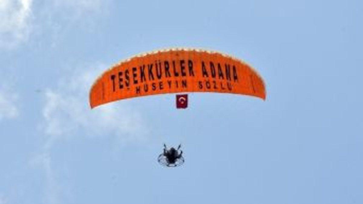Adana Havacılık ve Adrenalin Sporları Kulübü (AHAS ) Başkanı Güner Akkaya, üzerinde “Teşekkürler Adana-Hüseyin Sözlü” yazılı paramotor ile Adana turu attı.Yurt dışı müsabakalarda Türkiye’yi yurt içinde de Adana’yı yamaç paraşütünde başarıyla temsil ederek sayısız madalya ve kupa kazanan AHAS’ın Başkanı ve pilotu Güner Akkaya, Hüseyin Sözlü’nün Adana Büyükşehir Belediye Başkanı olmasının ardından güzel bir gösteriye imza attı.Üzerinde Adana Büyükşehir Belediye Başkanı Hüseyin Sözlü’nün seçim sonrası kullandığı “Teşekkürler Adana” sloganının yer aldığı paramotor ile Adana turu atan Güner Akkaya’nın bu gösterisi Adanalılar tarafından ilgiyle izlendi.AHAS Başkanı Güner Akkaya, “Sayın Başkanımız Hüseyin Sözlü, seçimlerden başarıyla çıkarak Adanamızın Büyükşehir Belediye Başkanı oldu. Kendisi Adana’ya büyük hizmetler yapacaktır. Buna inandığımız için böyle bir uçuş gerçekleştirdik” dedi.