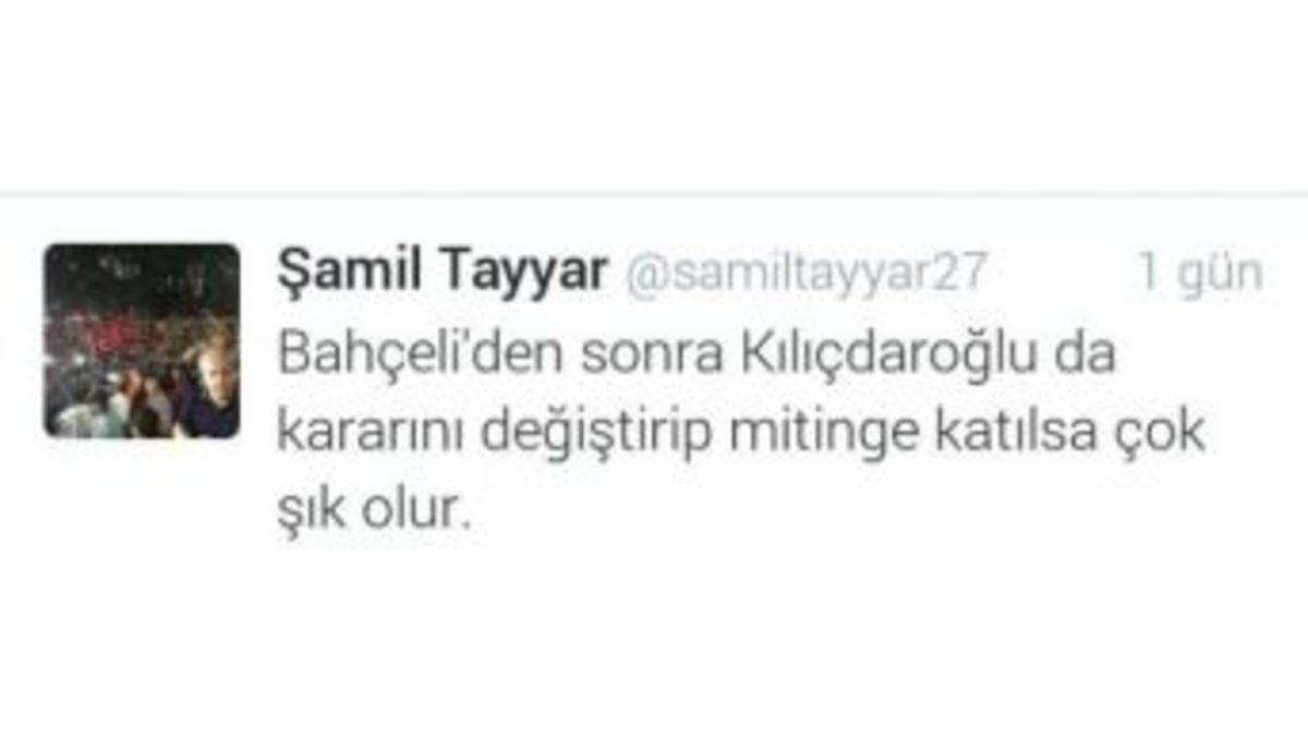 AK Parti Gaziantep Milletvekili Şamil Tayyar, CHP Genel Başkanı Kemal Kılıçdaroğlu’na mitinge katılım çağrısı yaptı.Cumhurbaşkanı Recep Tayyip Erdoğan’ın katıldığı televizyon programında demokrasi nöbeti 7 Ağustos Pazar günü İstanbul’da Yenikapı meydanında taçlandıracağını söylemesi üzerine diğer siyasi partilerin katılıp katılmayacağı merak ediliyordu. Davete ilk olumlu cevap veren MHP Genel Başkanı Devlet Bahçeli oldu. CHP Genel Başkanı Kemal Kılıçdaroğlu ise mitinge katılmak yerine parti heyetinin göndereceğini demesi üzerine AK Parti Gaziantep Milletvekili Şamil Tayyar sosyal medya hesabından Kılıçdaroğlu’na mitinge katılım çağrısında bulundu.AK Parti Şamil Tayyar sosyal medya hesabından yaptığı mitinge katılım çağrısında, ”Bahçeli’den sonra Kılıçdaroğlu da kararını değiştirip mitinge katılsa çok şık olur” diyerek CHP Genel Başkanı Kemal Kılıçdaroğlu’nu mitinge davet etti.