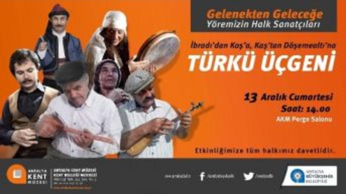 Antalya Büyükşehir Belediyesi Kent Müzesi, yöresel sanatçıları “Yöremizin Halk Sanatçıları-Gelenekten Geleceğe” etkinliği ile Antalyalıları buluşturmaya devam ediyor. Beş otantik sanatçı “Türkü Üçgeni” ile 13 Aralık’ta AKM Perge Salonu’nda bir araya geliyor.Büyükşehir Belediyesi Kültür ve Sosyal İşler Dairesi Başkanlığı’na bağlı Kent Müzesi Kent Belleği Merkezi, Teke Yöresi’nin otantik sanatçılarının performanslarını hem kayıt altına alıyor, hem de Antalyalılarla buluşturuyor.Türkü Üçgeni etkinliğinde İbradı, Kaş, Elmalı, Döşemealtılı beş otantik sanatçı, Antalyalılara türkü şöleni yaşatacak. Yusuf Gök-Üç Telli, Ali Ulutaş-Dört Telli, Mehmet Yengin-Tırnak Kemane ve Sipsi, Gülay Diri-Tef, Ayşe Dohan-Boğaz Havası ile Antalya Kültür Merkezi(AKM) Perge Salonu’nda unutulmaz bir dinleti sunacak.