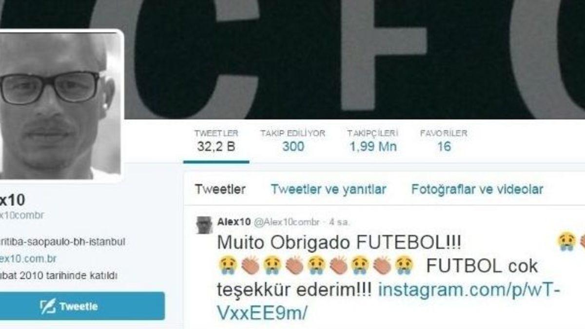 Fenerbahçe’nin unutulmaz oyuncusu Alex De Souza, futbol hayatını noktalarken sarı-lacivertli takımı da unutmadı.Alex De Souza bugün Brezilya Ligi’nde oynanan Coritiba-Bahia maçı ile aktif futbol hayatını noktaladı. Yıldız oyuncu karşılaşma öncesi sahaya Coritiba ve Fenerbahçe bayrakları ile çıktı. Yeşil sahalara 37 yaşında veda eden yıldız oyuncu, maç öncesi twitter hesabından Türkçe ve Portekizce olarak, "Futbol çok teşekkür ederim" mesajını yayımladı.