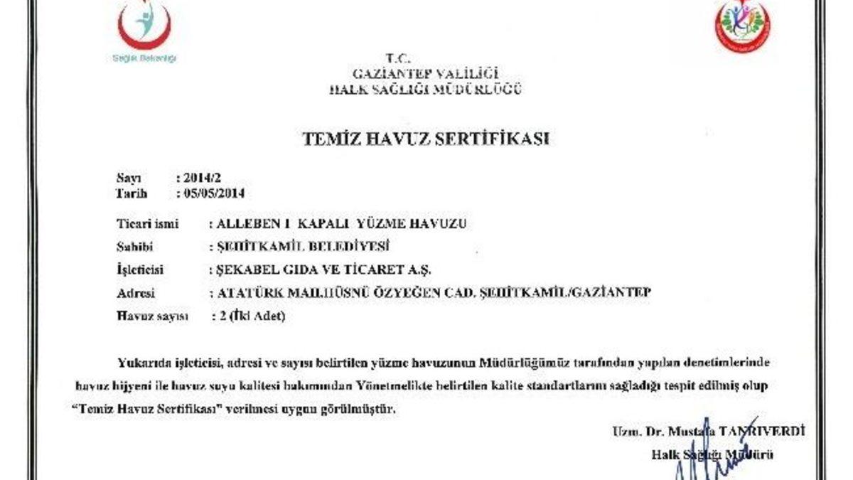 Gaziantep Valiliği Halk Sağlığı Müdürlüğü tarafından yapılan denetimlerde, Şehitkamil Belediyesi’ne bağlı Alleben1 Yüzme Havuzu ve Alleben 2 Yüzme Havuzu, 98 puanla, kalite standartlarına uygunluğu, havuz hijyeni ve havuz suyu kalitesi onaylanarak, “Temiz Havuz Sertifikası” ödülüne laik görüldü.Şehitkamil Belediyesi tarafından 2012 yılında hayata geçirilen Alleben1 ve Alleben2 Yüzme Havuzları, temiz olması ve kalitesiyle başarılarına bir yenisini daha ekledi. 8 bin metrekare arazi üzerinde, bin 240 kişilik tribünü ve ek engelli havuzu ile faaliyet gösteren Alleben 1 ve 2 yüzme havuzları, Gaziantep Valiliği Halk Sağlığı Müdürlüğü tarafından yapılan denetimler sonucunda “Temiz Havuz Sertifikası” ödülüne laik görüldü. Şehitkamil Belediyesi Alleben Yüzme Havuzu Genel Koordinatörü Cengiz Bingül yaptığı açıklamada, “Vatandaşlara temiz ve nezih ortamda spor yapma imkanı sunan Alleben havuzları içerisinde yüzme eğitiminin yanı sıra fitness, step, aerobik, pilates ve spinning branşlarında, bay ve bayanlara yönelik programlarla eğitim faaliyetlerine devam ediyor. Haftada üç gün, üç seans halinde devam eden çalışmalarda ayrıca yaz tatilinde öğrencilerimize yönelik alternatif havuz programı hazırladık. Alleben Yüzme Havuzu Sağlıklı Yaşam ve Spor Merkezi'nde, üyelerin ihtiyaç ve taleplerine özgü uygulanan programlar, vatandaşlarımız tarafından büyük bir memnuniyetle karşılanıyor. Bu yılda, Gaziantep Valiliği Halk Sağlığı Müdürlüğü tarafından yapılan denetimler sonucunda, Alleben yüzme havuzlarımız ‘Temiz Havuz Sertifikası’ ödülüne laik görüldü. Bu belgeyi almamıza destek olan tüm sporcu, veli ve üyelerimize başarımıza destek oldukları için teşekkür ederim” dedi.