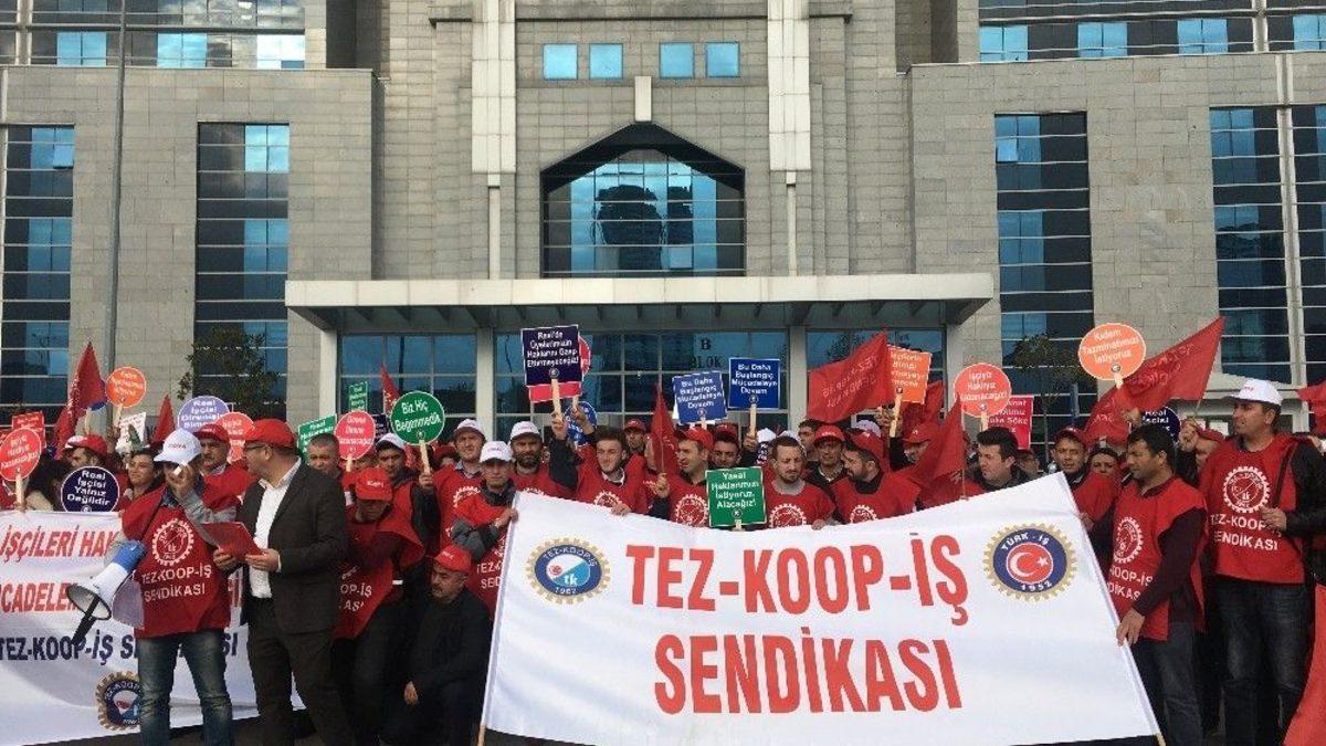 Tez-Koop-İş Sendikası Alman firması REAL Hipermarketler Zinciri İşletmesi’nde çalışan işçilerin haklarını savunmak amacıyla Kartal’daki Anadolu Adalet Sarayı önünde eylem yaptı.Tez-Koop-İş Sendikası, Alman firması REAL Hipermarketler Zinciri İşletmesi çalışanları ile birlikte REAL’in iflası açıklaması üzerine kıdem ve ihbar tazminatını alamadıkları iddiasıyla Kartal’daki Anadolu Adliyesi B Blok -4’üncü kata gelerek açıklamalarda bulundu.“Real işçileri haklarını alana kadar mücadelemizi sürdüreceğiz” yazılı pankartla Anadolu Adalet Sarayı’na gelen kalabalık bir grup ellerinde “Real işçisi yalnız değildir”, “İşçiyiz, haklıyız, kazanacağız” yazılı dövizlerle slogan attı.Tez-Koop-İş Sendikası Genel Yönetim Kurulu adına açıklama yapan Genel Örgütlenme Sekreteri Çağdaş Duyar, “Sendikamızın toplu iş sözleşmesinin yetkisinin bulunduğu Beğendik Mağaza İşletmelerine ait Real Hipermarketler Zinciri’nde Temmuz ayı sonunda iflas işlemleri başlatılmış ve buna bağlı olarak yasalardan ve yürürlükteki toplu iş sözleşmesinden kaynaklanan kıdem tazminatı başta olmak üzere ücret ve sosyal haklar ödenmemiş yada eksik ödenmiştir” dedi.Sendika tarafından hukuki sürecin başlatıldığını belirten Duyar, “Sendikamız Tez-Koop-İş, REAL’de çalışan üyelerimizin yasalardan ve toplu iş sözleşmesinden doğan haklarının geciktirilmeden ödenmesi için başlatılan hukuki süreci yakından takip etmekte ve bu süreçte üyelerimizin herhangi bir zarara uğramaması için mücadele kararlılığını sürdürmektedir. Tez-Koop-İş Sendikası olarak REAL işçileri tüm haklarını alana kadar mücadele etmeye devam edeceğiz” ifadelerini kullandı.Sendika üyeleri ve REAL çalışanlarından oluşan grup açıklamanın ardından adliyeden ayrıldı.