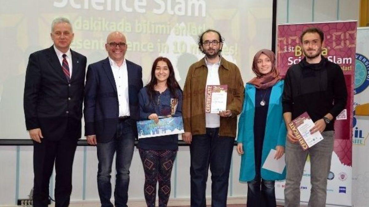 Almanya Büyükelçiliği tarafından Türkiye’deki genç yetenekleri keşfetmek amacıyla düzenlediği yarışmanın Bursa ayağı tamamlandı.Almanya Büyükelçiliği tarafından Türkiye’deki genç yetenekleri keşfetmek amacıyla Türkiye’nin 6 farklı şehrinde düzenlenen Grand TurkeyScience Slam 2015/2016 yarışmasının Bursa ayağı Uludağ Üniversitesi’nde gerçekleştirildi.Bursa Science Slam adıyla Bilkent Üniversitesi’nden Dr. LutzPeschke’nin direktörlüğünde düzenlenen yarışmada öğrenciler 10 dakika içerisinde seçtikleri bilimsel bir konuyu katılımcılara anlattı. Ankara, İzmir, Trabzon, Konya ve İstanbul ile birlikte Bursa’da da gerçekleştirilen yarışmalarda yaptıkları sunumlar ile birincilik kazanan öğrenciler 26 Nisan’da İstanbul’daki Almanya Büyükelçiliği’nde düzenlenecek olan büyük finalde şampiyon olabilmek için son kez yarışacaklar. Yarışmayı kazanan öğrenci ise Berlin’e 2 kişilik seyahat bileti kazanacak.ALPER, “BİLİMİ HER ALANDA DESTEKLİYORUZ”Uludağ Üniversitesi’nin ev sahipliğini yaptığı Bursa Science Slam yarışması hakkında bilgi veren UÜ Rektör Yardımcısı Prof. Dr. Eray Alper, üniversite olarak bilimi her alanda desteklediklerini söyledi. Yarışmaya katılacak öğrenciler için öncesinde kısa bir bilgilendirme toplantısı düzenlediklerini kaydeden Prof. Dr. Eray Alper, “Bugün 4 öğrenci adayımız sunum yaptı. Katılımcılardan en yüksek puanı almak için yarıştılar. Dünya genelinde büyük firmalar tarafından desteklenen ve Almanya Büyükelçiliği tarafından düzenlenen bilimsel bir yarışmaya ev sahipliği yapmaktan mutluluk duyduk. Çok başarılı ve eğlenceli bir etkinlik oldu. Tüm katılan öğrencilerimize de bundan sonraki çalışmalarında başarılar diliyorum. Gelecek yıllarda da böylesi etkinliklerin kalabalık ve daha katılımcı bir şekilde devam etmesini temenni ediyorum” dedi.4 öğrencinin farklı konular üzerine hazırladıkları bilimsel sunumlar ile katıldığı yarışmada 1.liğiBursa Teknik Üniversitesi Mühendislik Fakültesi Mekatronik Bölümü 3. Sınıf öğrencilerinden Gamze Karakaş, Zaman isimli sunumu ile elde etti.
