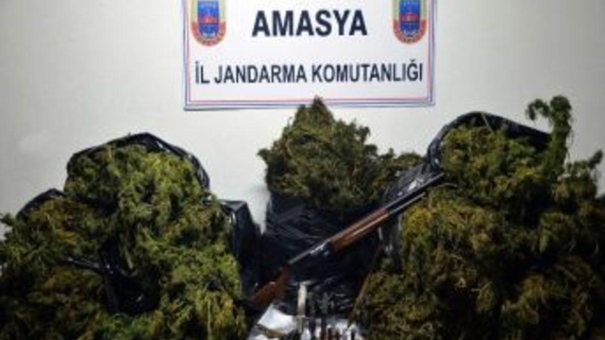 Amasya’da jandarmanın bir köy evinde yaptığı aramada 60 kilo esrar ele geçirildi.Amasya Cumhuriyet Başsavcılığı'ndan yapılan açıklamada, Amasya’nın Taşova ilçesine bağlı Ardıçönü köyünde yaşayan H.Y.'nin uyuşturucu madde imal ve ticareti yaptığı yönünde ihbar alan Amasya İl Jandarma Komutanlığı Kaçakçılık ve Organize Suçlarla Mücadele Şubesi (KOM) ekiplerince şahsa ait evde yapılan aramada 60 kilo esrarın yanı sıra 1 ruhsatsız tabanca, 2 şarjör, 42 mermi, 1 ruhsatsız otomatik av tüfeği, 10 av tüfeği mermisi ile 4 bıçak ele geçirildi.Yakalanan H.Y.’nin gözaltına alındığı bildirildi.