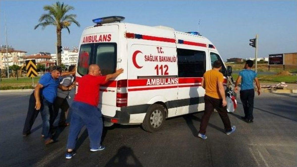 Manavgat ilçesinde, trafik kazasında yaralananları almaya giden 112 ambulansı ticari taksiyle çarpıştı. Yol ortasında kalan ambulansı vatandaşlar iterek kenara çekti.Akseki Güçlük Mahallesi’nde meydana gelen bir kazada yaralananları almaya giden Niyazi Daban’ın idaresindeki 112 ambulansı, Manavgat Otogar Kavşağı’nda Abdullah Aksoy idaresindeki 07 J 0012 plakalı ticari taksi ile çarpıştı. Çarpışmanın şiddetiyle ticari taksi yan yatarak durabilirken iki araçta da büyük çapta maddi hasar meydana geldi. Kazada şans eseri yaralanan olmadı.Kaza sonrası ambulans yol ortasında kalınca, bu defa iş vatandaşlara düştü. Çevredeki vatandaşların ambulansı iterek yol kenarına almaya çalışması ilginç görüntüler oluşturdu.