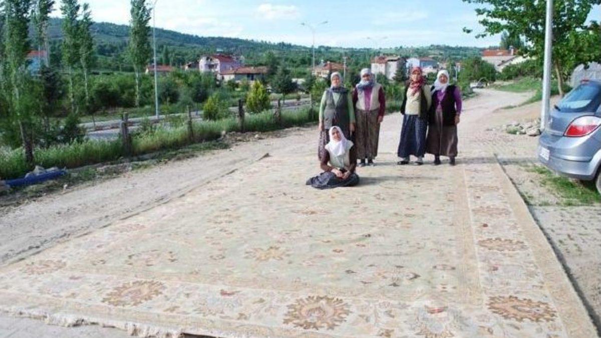 Özel bir halı firmasının Pazarlar temsilcisi olan Sevim Karakaş, "İlçemizde yaklaşık 3 ay önce dokunmaya başlayan halının eni 8, boyu 12 metredir. Toplamda 96 metre kare olan halıyı 9 kadın dokudu. 700 kilogram yün kullanıldı. Kök boya, çift düğüm, yün olarak dokunan halıda "Uşak" modeli kullanıldı. Bu iş el emeği göz nurudur. Halı tek tek, ilmek ilmek dokunuyor. Gecelerini gündüzüne katarak el emeği göz nuru katarak dokudular. 82 günde tamamlanan halıdan dokumacıların tamamı toplam 10 bin lira aldılar" diye konuştu.