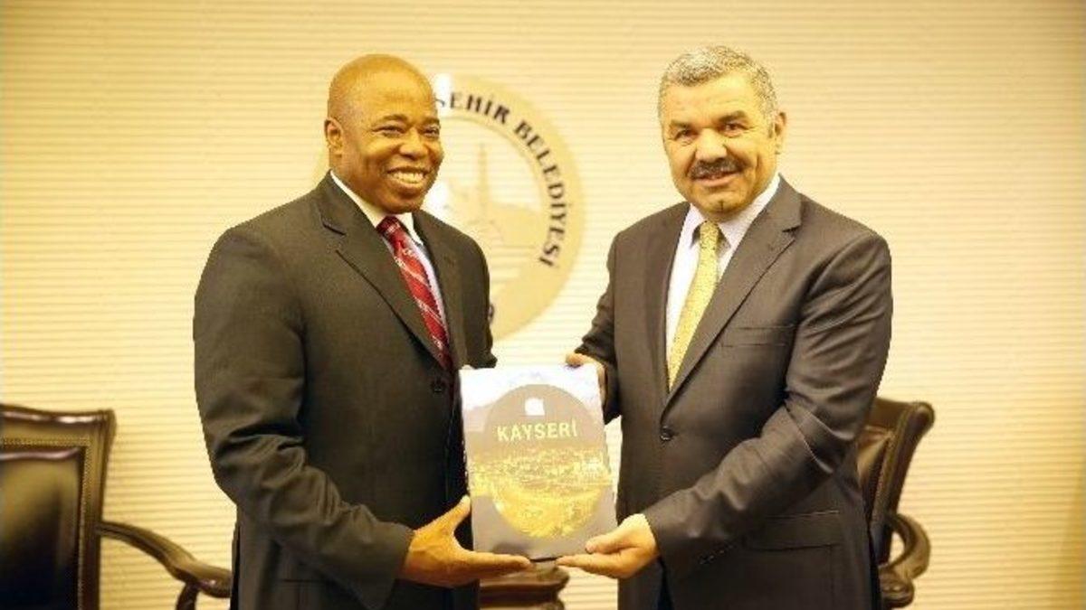 Amerika’nın New York şehrinin en büyük, en kalabalık ve en zengin bölgesi olan Brooklyn’in Belediye Başkanı Eric Adams Büyükşehir Belediye Başkanı Mustafa Çelik’i ziyaret etti. Kayseri’nin çok gelişmiş bir şehir olduğunu ifade eden Konuk Belediye Başkanı, Brooklyn’den "Amerika’nın ve New York’un Kayseri’si" olarak bahsetti. Başkan Mustafa Çelik de her iki şehir arasında, ulusal çıkarlara aykırı olmayacak her türlü işbirliğini yapabileceklerini belirtti.Büyükşehir Belediye Başkanı Mustafa Çelik, New York’a bağlı Brooklyn bölgesinin Belediye Başkanı Eric Adams ve beraberindekileri Başkanlık Makamında ağırladı."ŞEHİRLER İŞÇİ, KAYSERİ İŞ ADAMI GÖÇÜ VERİYOR"Konuk Belediye Başkanı’nın Kayseri’nin hızla büyüdüğünü belirterek, "Bu başarıyı neye borçlusunuz?" şeklindeki sorusu üzerine şehrimiz hakkında bilgi veren Büyükşehir Belediye Başkanı Çelik, Kayseri’nin beş bin yıllık ticaret geleneğine sahip bir tarihi bulunduğunu söyledi. Kayseri’nin coğrafi avantajları olmadığını belirten ve Kültepe’deki kazılarda çıkan tabletlerden bahsederek şehrin ticaret kültürüne dikkat çeken Başkan Çelik, "Kayseri’de bugün de şartlar değişmedi. Coğrafi avantajlarımız yok; ama müteşebbis insan gücümüz sayesinde Türkiye ortalamasının üzerinde büyüyoruz. Türkiye’de birçok şehir göç veriyor. O şehirler işçi göçü verirken Kayseri iş adamı göçü veriyor. Türkiye’nin en büyük ilk 1000 firmasının sahiplerinin yüzde 20’si Kayseri kökenli. Kayseri’nin bir başka değeri de hayırseverlerimiz. Zenginlerimiz Kayseri’nin üzerinden ellerlini çekmezler. Bunun neticesinde Kayseri’deki okulların yaklaşık yüzde 80’i hayırseverler tarafından yapıldı" dedi.BAŞKANLAR LOKOMOTİF OLACAKAmerikalı Belediye Başkanı Eric Adams’ın ziyaretinde her iki şehir arasında yapılabilecek işbirliği konusunda görüş alışverişinde de bulunuldu. Başkan Mustafa Çelik, belediye başkanlarının karşılıklı işbirliğinin lokomotifi olabileceklerini söyledi. Brooklyn Belediye Başkanı Adams iki şehirdeki, mühendisler, öğrenciler, ticaret adamları arasında işbirliği yapılabileceğini belirtti ve ziyaretlerinin temel amacının eğitim, ticaret ve kültürel alanda işbirliği olduğunu dile getirdi. Başkan Çelik de ulusal çıkarlara aykırı olmayacak her türlü işbirliğine hazır olduklarını kaydetti."AMERİKA’DA EN ÇOK TÜRK BROOKLYN’DE VAR"Oldukça sıcak ve samimi bir ortamda geçen ziyarette Brooklyn Belediye Başkanı Adams Amerika’da en büyük Türk nüfusunun Brooklyn’de bulunduğunu söyledi. Konuk Belediye Başkanı, Brooklyn’den Amerika’nın ve New York’un Kayseri’si olarak bahsetti. Başkan Adams’ın, Başkan Çelik’i Amerika’ya davet etmesi üzerine "Ramazan’da gelelim" ifadesini kullanan Başkan Mustafa Çelik, geçen Ramazan ayında iftar veren Brooklyn Belediye Başkanı’na bu vesileyle teşekkür etti ve bu davranışından dolayı memnuniyet duyduklarını söyledi.Ziyarette ayrıca Başkan Çelik ve Konuk Belediye Başkanı Adams tarafından ziyaretin anısına karşılıklı hediyeler takdim edildi.