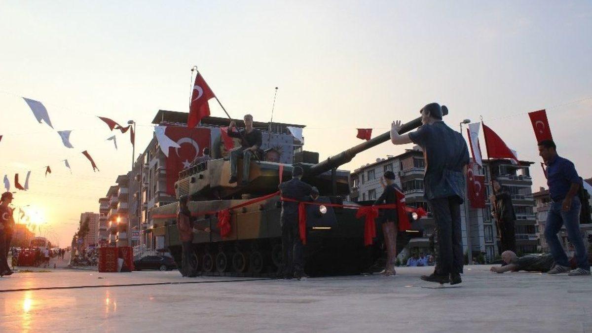Denizli’de, 15 Temmuz darbe girişiminde tanklara karşı darbe direnişini temsil eden 15 Temmuz Şehitler Anıtı törenle açıldı.Merkezefendi Belediyesi tarafından, Fethullahçı terör örgütünün darbe girişimi sırasında bir tankı durduran Metin Doğan’ı gösteren fotoğraftan esinlenilerek yapılan "15 Temmuz Demokrasi Anıtı" ve Şehitler yolu açıldı. Bir tankın önüne yatan ve tankın üzerine ellerinde bayraklarla çıkan vatandaşları temsil eden ve polyesterden yapılan tank anıt 6 ayda tamamlandı.Üzerine vatandaşların Türk bayrakları ile durduğu anıtının açılışına Vali Hasan Karahan, Büyükşehir Belediye Başkanı Osman Zolan, Pamukkale Üniversitesi Rektörü Prof. Dr. Hüseyin Bağ, Garnizon Komutanı Kurmay Albay Gültekin Yaralı, AK Parti İl Başkanı Necip Filiz ile daire müdürleri, meclis üyeleri, belediye başkanları ve vatandaşlar katıldı.Saygı duruşunda bulunulması, İstiklal Marşı’nın okunması ile başlayan törende şehitler için Kuran-ı Kerim okundu.Törende konuşan Merkezefendi Belediye Başkanı Muhammet Subaşıoğlu, yüzyıllarca adını tarihe altın harflerle yazdıran, bağımsızlık denilince akla gelen Türk milletinin, 15 Temmuz gecesi hain bir darbe girişimiyle karşı karşıya kaldığını belirtti. Subaşıoğlu, "15 Temmuz gecesi asker kılığına girmiş FETÖ mensubu teröristler tarafından yapılmak istenen darbe girişimini yüce milletimiz geri püskürtmüştür. Millet darbe yapmak isteyen hainlere darbe yapmıştır. Belediye olarak ilçemize kazandırdığımız bu anıt, milletin darbeye karşı gösterdiği müthiş direniş destanının bir sembolü olarak geceyi aydınlatacak, gündüz de tankın önüne siper olan kahramanlarımızın hatırasını yaşatacaktır" dedi.Törende konuşan Denizli Valisi Hasan Karahan, Türk milletinin hain kalkışmayı durdurarak dünyaya örnek bir destan gösterdiğini söyledi.Konuşmalardan sonra törene katılanlar hep birlikte anıtın ve yolun açılışını yaptı. Açılıştan sonra Merkezefendi Kaymakamlığı ve Merkezefendi Belediyesinin işbirliğiyle Niğde’deki şehit Ömer Halisdemir’in mezarını ziyarete eden 20 öğrenci tarafından getirilen toprak, anıtın önünde oluşturulan alana protokol üyeleri tarafından atıldı.