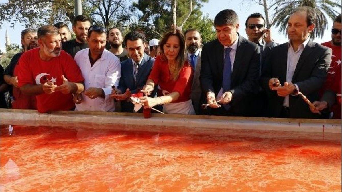 15 temmuz şehitleri için 9 ton suyla kitresi hazırlanan 241 metrekarelik ebruda; Mustafa Kemal Atatürk’ün, Şehit Astsubay Ömer Halisdemir, Cumhurbaşkanı Recep Tayyip Erdoğan, Başbakan Binali Yıldırım, CHP Genel Başkanı Kemal Kılıçdaroğlu ve MHP Genel Başkanı Devlet Bahçeli’nin portreleri yer aldı.Antalya Büyükşehir Belediyesi, 15 Temmuz darbe girişimi sırasında şehit olan 241 kişi için 9 ton su kullanılarak kitresi hazırlanan 241 metrekarelik ebru çalışması yaptı. Cumhuriyet Meydanı’nda kurulan tekneler üzerine Antalya Büyükşehir Belediyesi Başkanı Menderes Türel, Antalya Valisi Münir Karaloğlu ve vatandaşlar birlikte fırça attı.Mustafa Kemal Atatürk’ün, Şehit Astsubay Ömer Halisdemir, Cumhurbaşkanı Recep Tayyip Erdoğan, Başbakan Binali Yıldırım, CHP Genel Başkanı Kemal Kılıçdaroğlu ve MHP Genel Başkanı Devlet Bahçeli’nin portrelerinin yer aldığı beze ’Tek vatan, tek bayrak, tek devlet’ yazıldı. Kırmızıya boyanan bez, iki ucundan vinç yardımıyla kaldırılmak istendi. Ancak 2 defa vince bağlı uçlar kopunca eseri tamamlayan vatandaşlar bezi uçlarından tutarak havaya kaldırdı ve eser tamamlandı.Başkan Menderes Türel, büyük bir şerden bir hayır doğduğunu belirterek çok önceden başlayan bir kuşatmadan 15 temmuz darbe girişimiyle Türkiye’nin kurtulduğunu söyledi. 15 Temmuz’da şehit olanların Türkiye’ye büyük bir sorumluluk yüklediğini de belirten Türel, "Bu yıl Cumhuriyet Bayramı’nı çok farklı olarak kutlayacağız. Cumhuriyetimizin Kurucusu Mustafa Kemal Atatürk’ün, Ömer Halisdemir’in Cumhurbaşkanımız Recep Tayyip Erdoğan, Başbakanımız Binali Yıldırım, CHP Genel Başkanı Kemal Kılıçdaroğlu ve MHP Genel Başkanı Devlet Bahçeli’nin portreleri Yenikapı ruhunu anımsatmak adına bu ebruya işlendi. Dünyanın en büyük ebru çalışmasında 300 arkadaşımız 241 metrekarelik bu çalışmayı gerçekleştirdi. Rekorlar kitabına girecek bir çalışmaydı ama bu eserin anlamı gölgelenmesin diye rekor başvurusunda bulunmadık. Sadece noter tasdiki alarak tarihe not düştük. 9 ton su kullanılarak kitre hazırlandı" dedi.Çalışmanın ardından Antalya Büyükşehir Belediyesi Mehteran takımı gösteri yaptı.