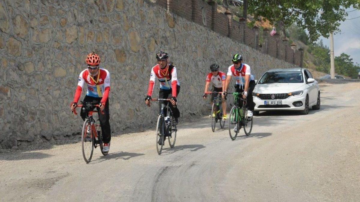 Konya’dan İstanbul’a düzenlenen “15 Temmuz Şehitlerimiz İçin Ahde Vefa Bisiklet Turu” kapsamında pedal çeviren 4 öğretmen Bilecik’te de mola verdi.Selçuklu İlçe Milli Eğitim Müdürlüğü’nde görevli 4 öğretmen, ilk olarak Bilecik Şehitliği’ni ziyaret ederek 15 Temmuz şehitleri için dua etti. Ardından, Bilecik Belediyesi’ni ve Saat Kulesi’ni ziyaret eden öğretmenler, burada Bilecik Belediye Başkanı Nihat Can ile bir araya geldiler.15 Temmuz şehitleri için 650 kilometre yol kat edeceklerini anlatan Hoca Cihan Hüseyin Yıldız İlköğretim Okulu öğretmeni Alper Can, Bilecik’te olmaktan çok mutlu ve keyifli olduklarını belirtti. Can, “Biz 10 Temmuz günü tura başladık. Bugün 5’inci günümüzdeyiz. Konya Ilgın, Çay, Afyon, Eskişehir’den sonra Bilecik’teyiz. Burada olmaktan çok mutluyuz, çok keyifliyiz. Biz öğretmeniz. İşimiz öğretmek. Tatildeyiz, ama ’eğitimin, öğretimin tatili olmaz’ dedik. Yola bu maksatla çıktık. İki yıl önce yapılan o hain kalkışmanın acılarını unutturmamak, şehitlerimizi unutturmamak, unutmamak adına yola çıktık. Bunun ispatı için yoldayız. Çığ gibi büyüyerek 15 Temmuz’da köprüde bunun cevabını vereceğiz. Benim yaşım 47, arkadaşlarım da 45 ve 47 arasında değişiyor yaşları. Ama görüyorsunuz anlatmaya gerek yok. Hiçbir yorgunluk yok. Allah’ın izniyle dimdik devam ediyoruz” ifadelerine yer verdi.Konuşmaların ardından Bilecik Belediye Başkanı Nihat Can da gelen konuklarına teşekkür ederek, kendilerine hediye takdiminde bulundu.
