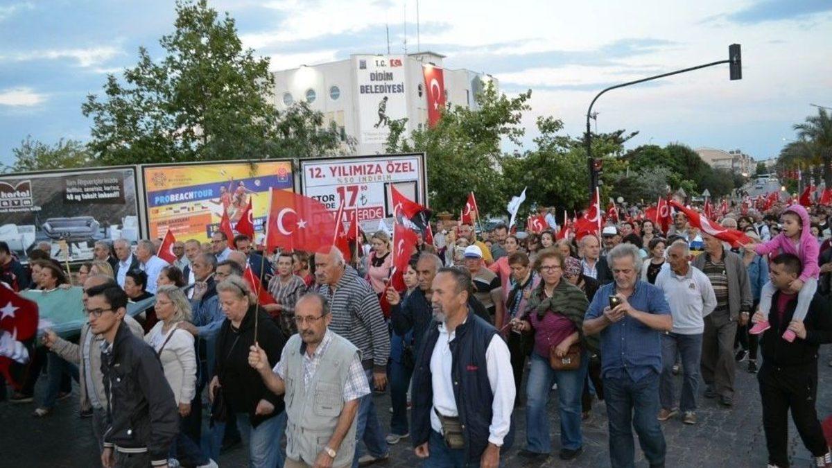 Didim’de 19 Mayıs Atatürk’ü Anma Gençlik ve Spor Bayramı dolayısıyla Fener alayı düzenlendi. Yürüyüşte sloganlar atıldı, meydanda Grup Eflatun mini konser verdi.Didim Belediyesi önünde başlayan Fener alayına motosikletçi grupları, izciler de destek verirken, yürüyüş esnasında dev Türk Bayrağı ile Atatürk posteri taşındı. Cumhuriyet Caddesi boyunca devam eden ve Atatürk Bulvarında süregelen yürüyüşe Didim Belediye Başkanı A. Deniz Atabay, CHP İlçe Başkanı Gökmen Karataş ile çok sayıda vatandaş katıldı.Ellerinde meşaleler ve Türk Bayrakları ile Didim caddelerinde yürüyen kalabalık grup zaman zaman sloganlar attı. Müzik eşliğinde devam eden ve Kent Meydanında sona eren yürüyüşe çok sayıda Didimli katıldı. Kent Meydanında toplanan kalabalığa seslenen Didim Belediye Başkanı A. Deniz Atabay “Bir avuç insanın davasına inanmış kişilerle beraber bir gemi ile Samsun’a çıkışının 98. yılında bir aradayız. Atatürk’ü Anma Gençlik ve Spor Bayramımız tüm memleketimize kutlu olsun. Ülkemiz için hepimizi mücadele ediyoruz. Laik düzenimize uzanan eller için mücadele ediyoruz. Bizler hukuk sistemi içerisinde mücadelemize devam edeceğiz.”dedi.Meydandaki ailelere seslenen Atabay “Gençlerimizi sistemin dışında tutmayalım. Bugün onların bayramı; Ulu Önder Atatürk yıllar önceden bunu görmeseydi bu ülkeyi gençleri emanet etmezdi. Bugün ise içinde bulunduğumuz sistem gençleri hep dışarıda tutuyor. Gençler mücadeleyi bizlerle beraber yapsın; korkmayalım”dedi. Gençlere de seslenen Atabay “Bu bayram sizin bayramı; Atatürk’ü sizler savunacaksınız bizlerde sizin yanınızda olacağız. Laik düzenimizi ve Atatürk’ü hep birlikte koruyacağız" dedi.Konuşmanın ardından Grup Eflatun söylediği şarkılarla alandakilere hoş dakikalar yaşattı.