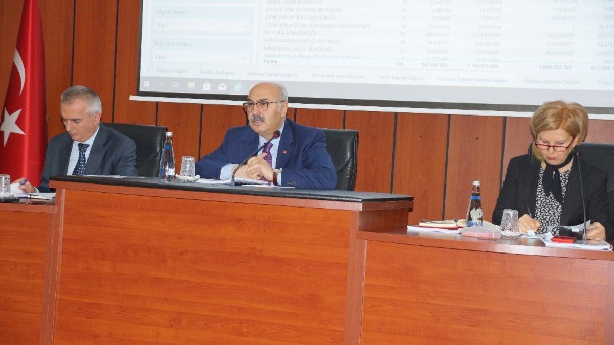 Aydın Valisi Yavuz Selim Köşger toplantıda yaptığı konuşmada, yatırımcı kuruluşlar bazında 2019 yılında uygulanan 275 projeden 90 adedinin tamamlandığını belirterek, “Geriye kalan 185 adet projenin 94 adedi devam etmekte, 26 adedi ihale aşamasında, 62 adedine ise çeşitli nedenlerden dolayı başlanamamış ve 3 adedi de tasfiye edilmiştir. Bu yatırımların proje bedeli 7 milyar 192 milyon 975 bin TL, önceki yıllar harcaması 1 milyar 96 milyon 393 bin TL, 2019 yılı ödeneği 543 milyon 936 bin TL’dir. 2019 yılında toplam harcama ise 415 milyon 560 bin TL’dir. Yatırımlarımızda yıl itibari ile yaklaşık yüzde 76 nakdi gerçekleşme sağlanmıştır. Yatırımcı kuruluşlarca 2019 yılında yapılan harcamaların sektörlere göre dağılımına bakıldığında ilk 5’te yer alan sektörler sırasıyla şöyledir. Tarım sektörü 113 milyon 199 bin TL harcamayla birinci sırada, Diğer Kamu Hizmetleri Sektörü 92 milyon 109 bin TL harcamayla ikinci sırada, Eğitim Sektörü 83 milyon 336 bin TL harcamayla üçüncü sırada, Ulaştırma-Haberleşme Sektörü 45 milyon 892 bin TL harcamayla dördüncü sırada, Enerji Sektörü 42 milyon 281 bin TL harcamayla beşinci sırada yer almaktadır” dedi.
