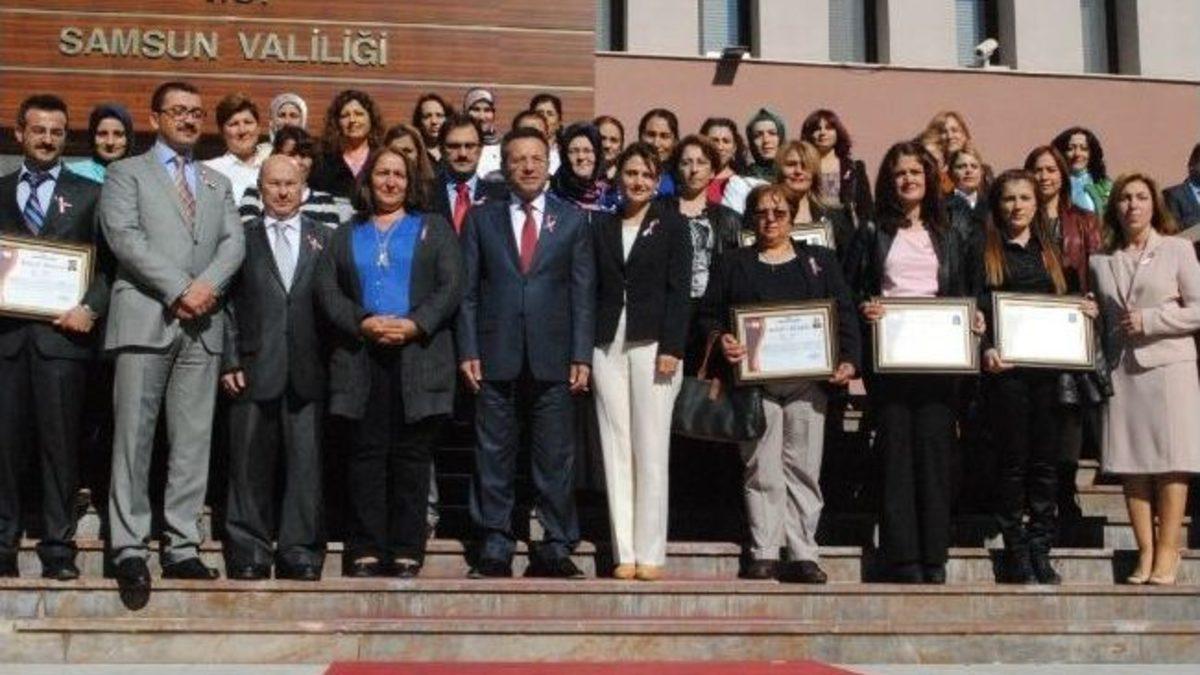 Samsun’da ‘Kadın Sağlığı Eğitim Projesi' kapsamında 284 bin kadına ulaşıldı ve 49 kanserli vaka tespit edildi.Samsun Valisi Hüseyin Aksoy, Samsun’da yürütülmekte olan ve koordinatörlüğünü Hülya Aksoy'un yaptığı ‘Kadın Sağlığı Eğitim Projesi'nde görev alan doktor, hemşire ve ebeleri başarı belgesiyle ödüllendirdi. Valilik Toplantı Salonu’nda düzenlenen törende, ‘Kadın Sağlığı Eğitim Projesi’nde görev alan Sağlık Müdürlüğü personeline başarı belgesi verilmesi öncesinde İl Sağlık Müdür Yardımcısı Dr. Hatice Öz tarafından yapılan çalışmalarla ilgili bir sunum gerçekleştirildi.Daha sonra Vali Hüseyin Aksoy başarı belgesi dağıtımı öncesinde yaptığı konuşmasında, “2011 yılı Ocak ayından itibaren Samsun’da ‘Kadın Sağlığı Projesi’ni uygulamaya geçirdik. Bu kapsamda Samsun’da hedef kitle olarak ön gördüğümüz 15-59 yaş grubundaki kadınlarımızın sayısı 390 bin ve şu ana kadar yapılan çalışmalar sonrasında bu kadınlarımızdan 284 bin kadınımıza ulaşmış durumdayız. Yüzde 73’lük bir orana ulaştık. Eksik olan yaklaşık 100 bin kişilik sayıya da, bu yıl içerisinde ya da 2014’ün ilk yarısında tamamlamayı ve hedefimize ulaşmayı amaçlıyoruz. Bu çalışmaların başlangıcından itibaren sizler sağlık çalışanları olarak projenin yürütülmesinde aktif rol aldınız. Bu eğitim çalışmalarında kadınlarımıza yönelik olarak verdiğimiz bu faaliyetlerde, yaptığımız bu çalışmalarda, sizler bire bir yer alarak, projenin içerisinde var olarak, çalışmaların amacına ulaşmasında önemli bir katkı sağladınız. Ben bu bakımdan bütün bu projede yer alan sağlık çalışanlarımıza çok teşekkür ediyorum. Bu gün bu projede çalışarak yer alan, emek veren arkadaşlarımıza başarı belgesi vereceğiz. Bu hafta ‘Meme Kanserinde Bilinçlenme Haftası’dır. Duyarlılığın en üst noktaya taşınması konusunda önemli bir haftadır. Bu hafta içerisinde bu çalışmalarımızı kamuoyuyla da paylaşmak adına bu başarı belgesini vermeyi uygun gördük” dedi.Proje içerisinde, kuruluş aşamasından itibaren birçok kişinin emeği ve katkısının olduğunu belirten Vali Aksoy, “İl Sağlık Müdürümüze, Halk Sağlığı Müdürümüze, Kamu Hastaneleri Genel Sekreterimize, Müdür Yardımcısı Hatice Öz hanımefendiye ve görevli personele çok teşekkür ediyorum. Yine önemli bir teşekkürü proje koordinatörü olarak başlangıcından itibaren yer alan ve birçok faaliyete katılarak desteklerini sağlayan Sayın Hülya Aksoy hanımefendiye ediyorum. Onun da bu projenin amacına ulaşması noktasında önemli katkıları ve destekleri oldu. Ben emeği geçen bütün kaymakam arkadaşlarımıza, onların eşlerine ve bu anlamda yürütülen faaliyetleri kamuoyunda paylaşan değerli basın mensuplarımıza, bilinçlenme adına yürütülen çalışmalarda yer alan bütün kurum ve kuruluşlarımıza çok teşekkür ediyorum” diye konuştu.“Bu bir sosyal sorumluluk kapsamı içerisinde asli görevlerimizin yanında mesai ayırarak kadınlarımıza ulaşmak ve onları bilinçlendirme adına yürüttüğümüz önemli bir çalışmadır” Vali Hüseyin Aksoy sözlerine şöyle devam etti: “Yapılan çalışmalarda bizim eğitim çalışmalarımıza katılarak bundan sonraki süreç içerisinde yapılan çalışmalarda 49 kanserli vakanın tespit edildiğini görüyoruz. Bir kişiyi bile bu eğitim çalışmaları sonrasında biz eğer erken teşhis edebilirsek, bu bile bizi son derece memnun eder. Kadınlarımızın bu kanserden korunması anlamında erken teşhis ve onunla ilgili yapacakları mücadelede yaşamlarını sürdürebilme, yaşam kalitelerini yükseltebilme adına erken teşhisin önemi uzmanlarımız tarafından da ifade edilmektedir. Bu proje bu boyutuyla da çok önemli ve anlamlı bir projedir. Samsun’da bu anlamda yürüttüğümüz bu çalışmanın Türkiye geneline de örnek olabilecek çok anlamlı bir sayıya ve amaca doğru ilerlediğini biliyoruz. Ben tekrar bu çalışmalarda emeği geçen herkese teşekkür ediyorum.”Vali Hüseyin Aksoy konuşmasının ardından, Ocak 2011’de başlayıp Aralık 2013’te bitirilmesi planlanan ve eşi Hülya Aksoy'un koordinatörlüğünde gerçekleştirilen 'Kadın Sağlığı Eğitim Projesi' ile ilgili eğitimlerde ve muayenelerde özverili çalışan 30 Sağlık Müdürlüğü personelini tebrik ederek başarı belgelerini verdi.‘Kadın Sağlığı Eğitim Projesi'nde görev alan Sağlık Müdürlüğü personeline başarı belgesi törenine ayrıca, Sağlık İl Müdürü Yusuf Köksal, Halk Sağlığı Müdürü Uzm. Dr. Ertan Uzun ve Kamu Hastaneler Birliği Genel Sekreteri Hasan Rıza Aydın katıldı.