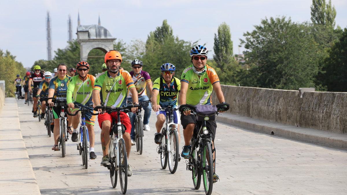 Edirne Belediye Bandosu eşliğinde saygı duruşunda bulunup, İstiklal Marşı okuyan bisikletçiler, festival alanından start aldı.