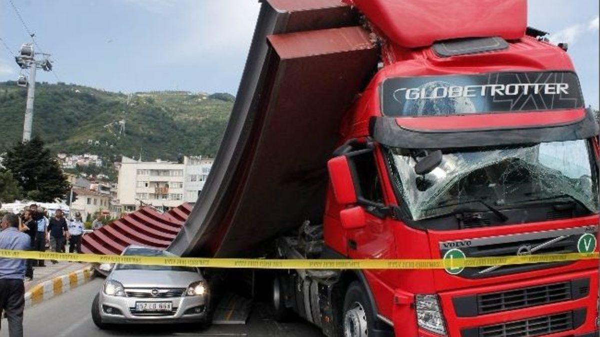 Ordu’da bir TIR'ın ani freni sonucu, üzerindeki 30 tonluk baraj kapağı otomobilin üzerine düştü. Kaza anı MOBESE kameralarına yansıdı.