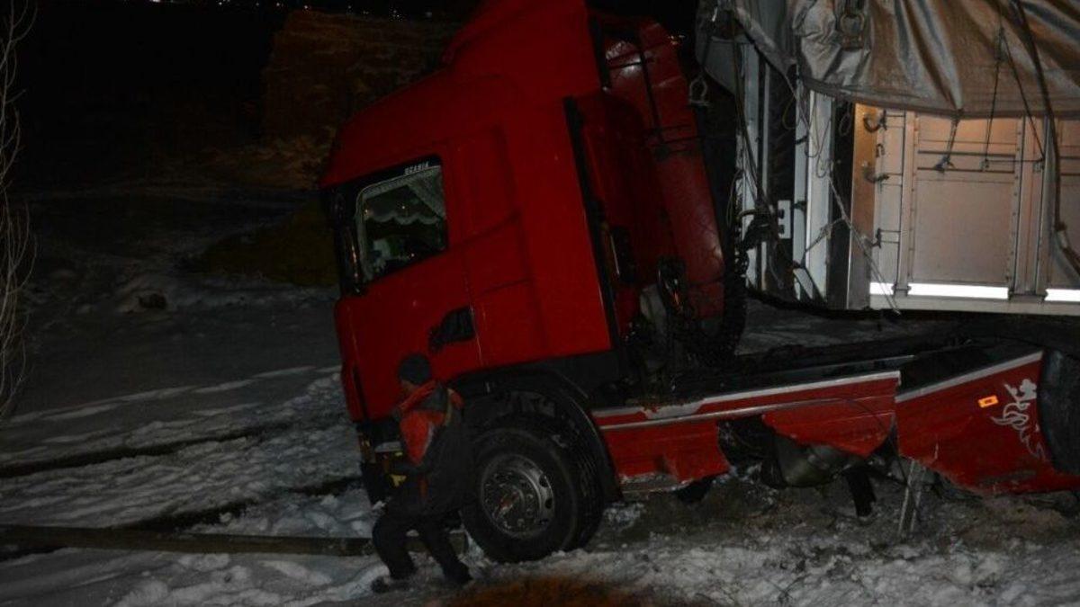 Erzurum’un Aşkale İlçesi’nde meydana gelen trafik kazasında buzlanma nedeniyle yoldan çıkan TIR uçurumun kenarında durabildi.Edinilen bilgiye göre, dün gece yarısında ilçe çıkışında meydana gelen kazada Şahin Yalvaç yönetimindeki 34 JC 4281 plakalı TIR D-100 karayolu Kara Köprü mevkiinde buzlanma nedeniyle direksiyon hakimiyetini kaybederek yoldan çıktı. Gümüşseren köyünün hemen girişinde uçuruma düşmekten son anda kurtulan TIR’da sürücü şans eseri kazadan yara almadan kurtuldu. Köyün 50 metre yakınında olan kazada eğer TIR makaslamayıp direk aşağı inse sonrasında köyde yaşayanların evlerine girebilirdi.Aşkale Trafik ekipleri hemen olaya müdahale ederek gerekli önlemleri alması diğer sürücülerin de kazaya karışmasını engellemiş oldu. Yaklaşık 1 saat ulaşıma kapanan yol çekici ve vinç sayesinde TIR’ın kaldırılmasının ardından yeniden ulaşıma açıldı.