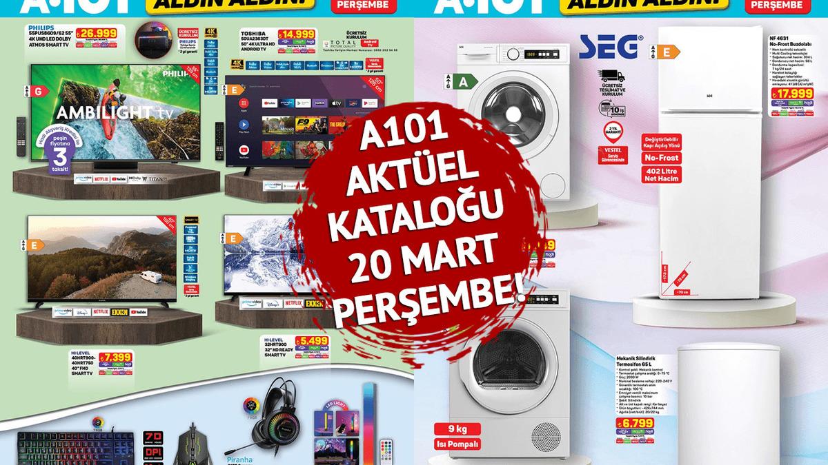 20 Mart 2025 Perşembe günü geçerli olan A101 Aktüel ve indirimli katolğunun ilk sayfasında yer alan ürünler:Philips 55" 4K UHD Led Dolby Atmos Smart Tv 26.999 TLHi-Level 40' FHD Smart Tv 7.399 TLToshiba 50' 4K Ultra HD Android Tv 14.999 TLHi-Level 32' HD Ready Smart Tv 5.499 TLPiranha Gaming Klavye 399 TLPiranha RGB Gaming Mouse 279 TLPiranha 2175 Oyuncu Kulaklığı 459 TLPiranha 8880 Oyuncu Kulaklığı 399 TLPiranha Ambiyans Işık 399 TL