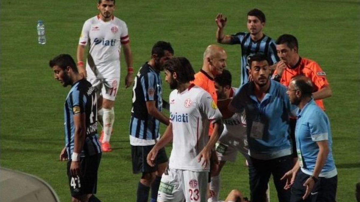 PTT 1. Lig play-off rövanş maçında Adana Demirspor, Antalyaspor’u 2-0 yenmesine rağmen, ilk maçta 3-0 yenildiği için finale yükselemedi. İki kırmızı kartın çıktığı karşılaşmada hakem yönetimini beğenmeyen taraftarlar, tribündeki koltukları sökerek sahaya attı. Bazı futbolcular ise saha kenarında ve koridorlarda kavga etti.Karşılaşmanın uzatma dakikalarında Adana Demirspor’lu Abdülkerim’in ikinci sarı karttı görerek oyundan atılmasından sonra başlayan olaylar, Hakem Ali Palabıyık’ın bitiş düdüğüyle daha da arttı. Tribündeki koltukları sökerek sahaya atan mavi-lacivertli taraftarlar, hakem yönetimine tepki gösterdi. Polis ve özel güvenlik ekipleri, taraftarların sahaya inmemesi için tribünler önünde güvenlik önlemi aldı. Bir taraftarın söktüğü yangın söndürme hortumunu ile polis ve güvenlik görevlilerini ıslatmaya çalıştı.FUTBOLCULAR ARASINDA KAVGA ÇIKTIBu sırada Antalyaspor’lu ve Adana Demirspor’lu oyuncular da saha kenarında birbirine girdi. Kavgaya Antalyaspor Antrenörü Yusuf Şimşek de dahil oldu. Yumruklaşmaların yaşandığı kavga soyunma odası koridorunda da devam etti.Maçın ardından Antalyaspor takım otobüsü geniş güvenlik önlemi altında kafilenin konaklayacağı otele götürüldü. Bazı taraftarların takım otobüsüne taş attığı görüldü.