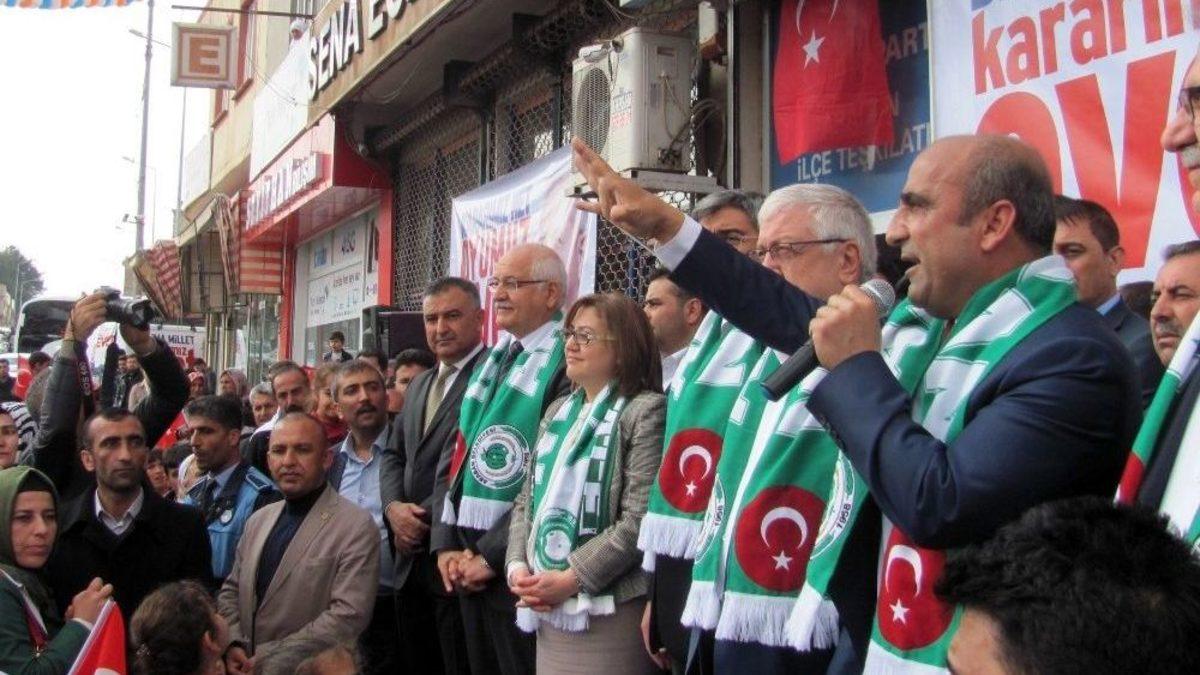 Ak Parti, 16 Nisan’da gerçekleşecek olan referandum için Gaziantep’in Araban ilçesindeki ‘Referandum Seçim Koordinasyon Merkezinin’ açılışını bugün yaptı.AK Parti Araban ‘SKM’ Seçim Koordinasyon Merkezi Açılışı için ilçeye gelen AK Parti Gaziantep İl Başkanı Mehmet Eyüp Özkeçeci, Gaziantep Büyükşehir Belediye Başkanı Fatma Şahin ve AK Parti Gaziantep Milletvekilleri Mehmet Erdoğan, Ahmet Uzer, Abdulkadir Yüksel, AK Parti Gaziantep eski milletvekili Gaziantep İl SKM Başkanı Mehmet Sarı ve beraberindeki heyet AK Parti Araban SKM önünde toplanan vatandaşlar tarafından davul zurna eşliğinde kurban kesilerek karşılanan heyet tarafından açılış yapıldı.İlçe merkezindeki Recep Tayip Erdoğan Parkı karşısındaki AK Parti Araban Seçim Koordinasyon Merkezi açılış konuşmasını yapan Araban Belediye Başkanı Mehmet Özdemir,’’16 Nisan günü yapılacak olan yeni Anayasa Referandumuna kadar ilçenin tümünü gece ve gündüz demeden karış karış gezerek Türkiye Cumhuriyetinin Yeni Anayasasını her vatandaşımıza tek tek anlatarak evet oyu isteyeceğiz’ ’dedi.AK Parti Gaziantep İl Başkanı Mehmet Eyüp Özkeçeci de yaptığı konuşmada, ’’Türkiye Cumhuriyetinin Yeni Anayasası için 16 Nisan tarihinde yapılacak olan referandum çalışmalarında ev ev gezerek yeni anayasayı vatandaşlarımıza tek tek anlatarak evet oyu isteyeceğiz’’ diye konuştu.AK Parti Hükumeti döneminde ilçeye yapılan hizmetlerden de bahseden Gaziantep Büyükşehir Belediye Başkanı Fatma Şahin, 16 Nisan da yapılacak olan yeni anayasa paketi için evet oyu istedi. Şahin konuşmasının devamında, ’’AK Parti olarak bu ülkede başbakan asan dönemi kapatacağız dedik, yeni Anayasa ile kapatıyoruz. AK Parti Hükumeti olmasa, AK Partinin milletvekilleri olmasa ben kimim ki tek başıma sizlere hizmet vereyim. AK Parti Hükumeti döneminde ilçeye yapılan hizmetlerden de bahsederek 16 Nisan da yapılacak olan yeni anayasa paketi için evet oyu istedi’’ ifadelerini kullandı.AK Parti Gaziantep Milletvekili Mehmet Erdoğan ise,’’Ardıl Barajında su tutumuna başlandığını su tutumu tamamlandığında Araban Ovasında 26 bin dönüme yakın kuru tarım yapılan arazilerde su tarıma geçilerek hem ülke hem de ilçe ekonomisine önemli katkı sağlanacağını belirterek Ardıl Barajının yapımına inanmayan muhalifler şimdide yeni anayasa referandumunda da hayır için çalışıyorlar onlara inanmayın. Çünkü onlar bir zamanlarda buraya gelip Ardıl Barajı yalan diye sizleri kandırmaya çalışmışlardı. Ardıl Barajı tamamlandı şimdi sıra Çat Boğazı ve Harmancık Barajlarında olduğunu söyleyen Erdoğan, Ardıl Barajı, Çat Boğazı Barajı ve Harmancık Barajları ile ilçede bir karış susuz tarım yapılan arazi kalmayarak tümünde sulu tarım yapılarak ülke ve ilçe ekonomisi kalkınacak. İşte bu hizmetler için 16 Nisan da yapılacak olan yeni anayasa referandumunda tüm Arabanlı hemşehrilerimin evet oyu kullanacağına inanıyorum’’diye konuştu.Açılış sonunda AK Partili heyete birer adet Araban Belediyesporun forması hatıra edildi.SKM Açılışından sonra AK Partili heyet Gaziantep Büyükşehir Belediyesi tarafından Dumlupınar Mahallesine yapılan Sosyal Tesisin açılışını da yaptı.