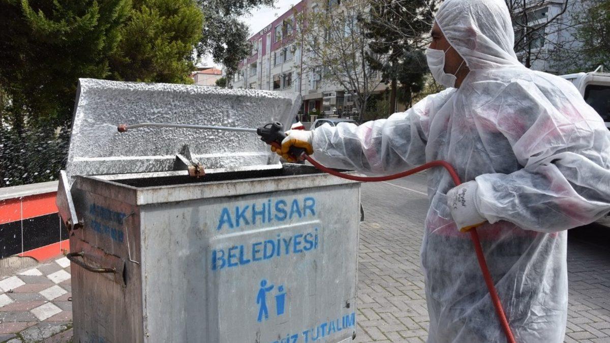 Akhisar Belediyesi Temizlik İşleri Müdürlüğü’ne bağlı ekipler, korona virüsle mücadele kapsamında ilçe genelinde çöp konteynerlerini de dezenfekte ediyor.