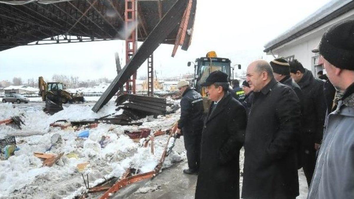 Konya’nın Akşehir ilçesinde kurulan kapalı pazar yerinin çatısında kar birikintisi ve şiddetli rüzgarın da etkisiyle meydana gelen çöküntü nedeniyle 4 kişi yaralandı. Hastaneye kaldırılan yaralıların sağlık durumlarının iyi olduğu bildirildi.Olay, sabah saat 09.30 sıralarında ilçede Perşembe günleri kurulan kapalı pazar yerinde meydana geldi. Edinilen bilgiye göre, son günlerde yağan yoğun karın pazar yerinin çatısına birikmesi ve şiddetli rüzgar nedeniyle çatının bir bölümünde çöküntü meydana geldi. Çöküntünün ardından pazarda esnaflık yapan 4 kişi demir konstrüksiyonların altında kaldı. İhbar üzerine olay yerine çok sayıda ambulans, itfaiye ve polis ekibi sevk edildi. Konya’dan da Ulusal Medical Kurtarma (UMKE) ekipleri bölgeye gönderildi. İtfaiye ile UMKE ekiplerinin çalışmasına vatandaşlar da destek verdi. Enkaz altında kalan yararlılar kısa sürede kurtarılarak ilçedeki çeşitli hastanelerde tedavi altına alınırken, yaralıların sağlık durumlarının iyi olduğunu öğrenildi.Çalışmaları yerinde takip eden Akşehir Belediye Başkanı Salih Akkaya yaptığı açıklamada, “Akşehir’imizde Perşembe pazarı olarak bilinen Pazar yerimiz 10 bin metrekarelik bir alanda kurulu. Bunun 3 bin metrekarelik kısmı kapalı, bu bölümün 4’te 1’i yoğun kar yağışı ve rüzgarın da etkisiyle göçtü. Ama çok şükür erken saatlerde olması can kaybına sebebiyet vermemiş oldu. 4 yaralımız var. Bunlardan birinin omzu kırık, birinde bacağında bir çatlak var diğer 2 yaralı daha normal herhangi hayati tehlikeleri yok Akşehir’imize geçmiş olsun” dedi.AK Parti Konya Milletvekili Mustafa Baloğlu da, olayın saat 9 buçuk civarlarında meydana geldiğini belirterek, “Kapalı pazar yerinin uç noktasında aşırı yağış nedeniyle kar yüklenmesi sebebiyle olan bir kaza herhangi bir can kaybımız yok. Şu anda 3 tane hafif yaralımız var bir hastamızın da omzu kırık hastalarımızın hayati tehlikeleri yok” diye konuştu.Pazar yerinin çatısının çöktüğü sırada olay yerinde bulunan pazarcılardan Mehmet Karataş, “Sabahleyin bir çıtırdama duyduk normal diye önemsemedik. Saat 9.20 civarında büyük bir çatırdı ile bir anda çöktü” şeklinde konuştu.Başka bir pazar esnafı Şaban Doğru da, “Tezgahı açtık. Bir anda bir çatırdama oldu. 2-3 saniye içinde göçtü. Canımızı zor kurtardık. 3-4 kişi altında kaldı onlarda hastaneye gittiler” dedi.Özel bir hastanede tedavi altına alınan yaralılardan Ayşe Karadaş (50), satış yapmak için tezgahı açmıştık. Daha sonra çatı bir anda çöktü. Demirlerin altında kaldım. Kafama dikiş atıldı. Buna da şükür” ifadelerini kullandı.Aynı hastanede tedavi altına alınan Mustafa Özbek (52) ise "Tezgahın arka tarafındaydım bir çatırdı koptu kaçmaya kalmadan üzerime çöktü" dedi.Hastanenin başhekimi Uzman Doktor Ali Galip Gündoğar da hastanelerine gelen yaralıların durumlarının iyi olduğunu söyledi.