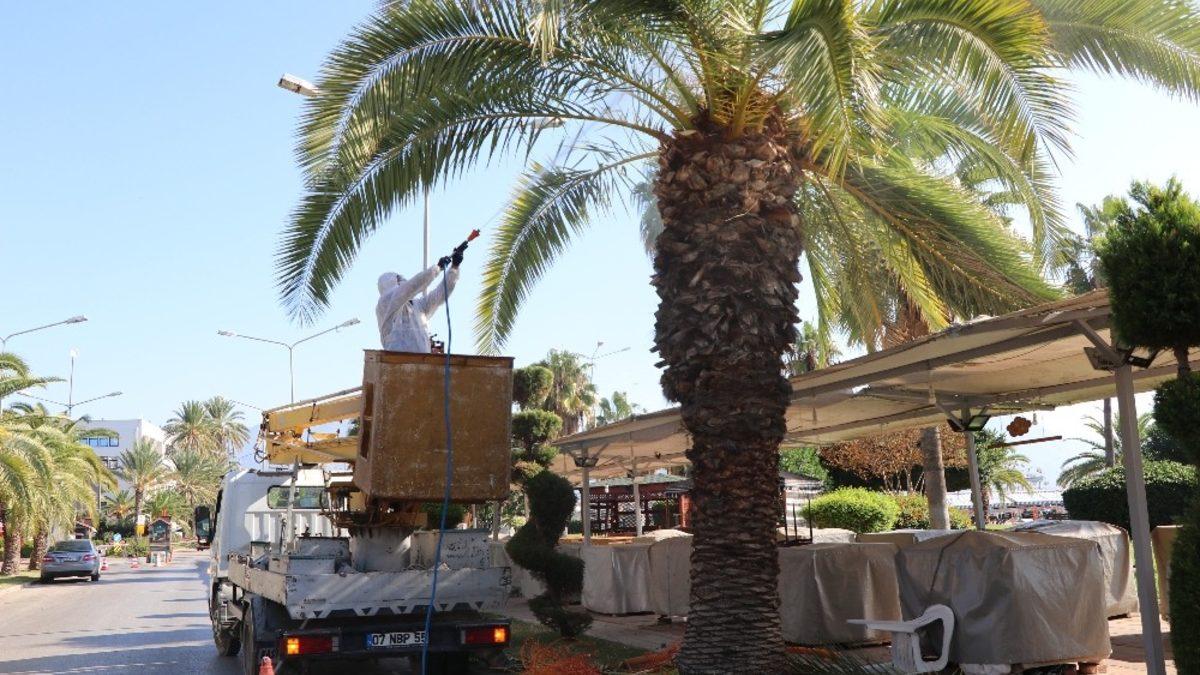 Alanya Belediyesi Park ve Bahçeler Müdürlüğü ekipleri, hurma ağacı başta olmak üzere palmiye türü ağaçlara zarar veren ve ‘kırmızı palmiye böceği’ olarak adlandırılan zararlıyla mücadeleye devam ediyor.