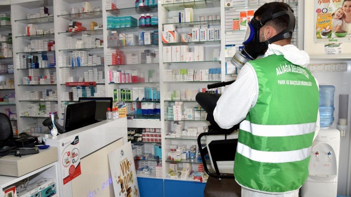 İzmir’in Aliağa ilçesinde, korona virüsüne karşı tedbirli davranılırken, belediye ekipleri eczaneleri dezenfekte etti.