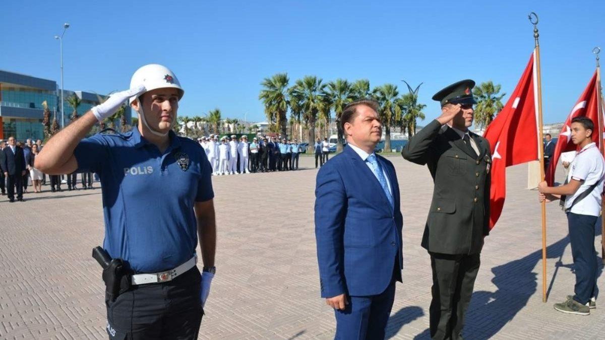 Aliağa Cumhuriyet Meydanında gerçekleştirilen törene Aliağa Kaymakamı Erhan Günay, Garnizon Komutanı Albay Faruk Altun, Belediye Başkan Vekili Murat Kuzumoğlu, İlçe Jandarma Komutan vekili Sedat Atıcı, İlçe Emniyet Müdürü Yasin Uğurtaş, Sahil Güvenlik Bot Komutanı Yüzbaşı Özgür Acar, İzmir İl Milli Eğitim Müdür Yardımcısı Alaaddin Bayat, İlçe Milli Eğitim Müdürü Zehra Tuba Kabakçıoğlu, daire amirleri, siyasi parti temsilcileri, sivil toplum kuruluşları, öğretmenler, öğrenciler, vatandaşlar ve gaziler katıldı. Tören, Cumhuriyet Meydanında bulunan Atatürk Anıtına çelenklerin sunumu ile başladı. Atatürk Anıtına çelenklerin konulmasının ardından saygı duruşunda bulunuldu ve İstiklal Marşı okundu.