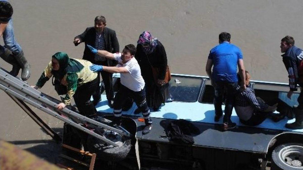 Amasya’da otomobille çarpıştıktan sonra köprüden Yeşilırmak’a uçan minibüsteki 14 kişi yaralandı.Minibüsün içinde azgın sularla mücadele eden sürücü ve 13 yolcu, olay yerine gelen dalgıç, itfaiye, AFAD, 112 ekipler ve polisler tarafından güçlükle çıkartıldı. Yaralılar sağlık ekiplerinin ilk müdahalesinin ardından ambulanslarla hastaneye götürüldü.Kaza, merkez Kurtboğan Köprüsü üzerinde meydana geldi. Edinilen bilgiye göre, Özkan Uzun’un kullandığı 05 M 0268 plakalı minibüs, köprü girişinde Tunahan Bektaş’ın kullandığı 28 DB 219 plakalı otomobille çarpışarak ırmağa uçtu. Suların içinde kalan yolcular, olay yerine gelen ekipler tarafından minibüsten çıkarıldıktan sonra uzatılan merdiven yardımıyla ırmaktan çıkartıldı. Durumu ağır olduğu için sağlık ekiplerinin müdahalesinin ardından sedyeye alınan Doğan Türkoğlu adlı vatandaş, bağlanan halatla yola çıkartıldı. Yaralılar 112 ambulanslarıyla hastaneye kaydırılırken, minibüs çekiciyle ırmaktan çıkartıldı. Amasya Belediyesi su altı kurtarma ekipleri de ırmak yatağını kontrol etti.Vali Vekili Ferhat Burakgazi ile Emniyet Müdürü Mehmet Artunay olay yerine gelerek inceleme yaptılar.