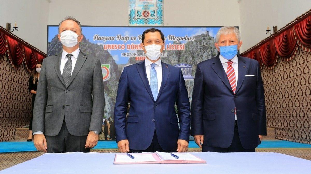 Amasya’nın tarihi zenginliklerinin vitrini konumundaki ‘Harşena Dağı ve Pontus Kral Kaya Mezarları’nın UNESCO Dünya Mirası Daimi Listesi’ne girmesi için Kültür ve Turizm Bakanlığı ile Amasya Belediyesi arasında iş birliği protokolü imzalandı.