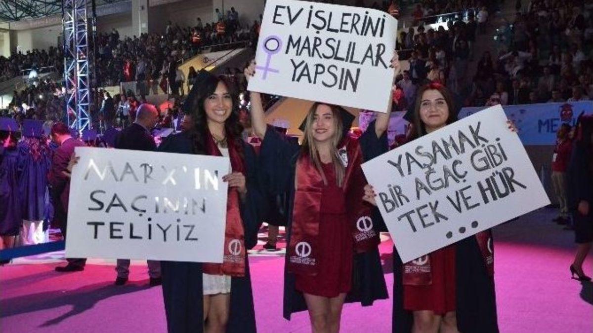 Eskişehir Anadolu Üniversitesi öğrencileri, mezuniyet coşkusu yaşıyor.İki Eylül Kampüsü’nde bulunan Anadolu Üniversitesi Spor Salonu’nda 6 oturumda gerçekleştirilecek olan mezuniyet törenlerinin üçüncüsünde, Edebiyat ve Eğitim Fakültesi öğrencileri mezuniyet coşkusu yaşadı. Bazı öğrenciler, Gezi olayları sırasında hayatını kaybeden Ali İsmail Korkmaz’ın fotoğrafını yakasına takarak ‘hani mezun olacaktık, hep 19 yaşında’ yazılı afişlerle dolaştılar.Dördüncü oturumda ise Spor Bilimler Fakültesi, Devlet Konservatuvarı, İletişim Bilimleri Fakültesi, Güzel Sanatlar Fakültesi Mimarlık ve Tasarım Fakültesi, Mühendislik Fakültesi, Porsuk Meslek Yüksekokulu ve Ulaştırma Meslek Yüksekokulu öğrencileri mezuniyet coşkusu yaşadı.Her iki oturumda da öğrenim görüp mezun olan öğrencileri mutlu günlerinde aileleri ve sevenleri de yalnız bırakmadı. Tören, Anadolu Üniversitesi Rektörü Prof. Dr. Naci Gündoğan, akademisyenler ve öğrencilerin katılımcıları selamlamasıyla başladı. Mezuniyet töreni, saygı duruşunda bulunulması ve İstiklal Marşı’nın okunmasının ardından Anadolu Üniversitesi Rektörü Prof. Dr. Naci Gündoğan’ın açılış konuşması ile devam etti.“EMANETLERİNİZE SAHİP ÇIKMAK İÇİN ELİMİZDEN GELENİ YAPTIK”Mezun öğrencileri ve ailelerini ağırlamaktan büyük mutluluk duyduğunu aktaran Rektör Gündoğan, öğrencilere sahip çıkmak adına şimdiye kadar ellerinden geleni yaptıklarını kaydetti. Gündoğan, “Çocuklarınızın daha güzel bir dünyada yaşama hayaliyle, yıllardır çaba sarf etmektesiniz. Yaptığınız fedakarlıkların değerinin ölçmek mümkün değil. Bizler, Anadolu Üniversitesi’nin bütün çalışanları, bize yüklediğiniz bu fedakarlıkların sorumluluğuyla, yıllardır emanetlerinize sahip çıkmak için elimizden geleni yaptık. Bütün imkanlarımızla, kurduğunuz hayallerin gerçekleşebilmesi için çalıştık. Yaşadığımız dünyanın gereklilikleri her neyse, çocuklarınızı bu gereklilikler doğrultusunda donatmaya uğraştık. Ve artık sahip oldukları bilgi birikimi ve kazandıkları tecrübeyle daha güzel adil ve mutlu bir dünya için, üzerilerine düşecek sorumlulukları yerine getirebilecek durumda olduklarından eminiz” dedi.“BUNDAN SONRAKİ HAYATINIZDA BİRÇOK SORUNLA KARŞILAŞACAKSINIZ”Konuşmasının devamında öğrencilere de seslenen Gündoğan, bundan sonraki hayatta karşılaşılabilecek sorunları hatırlatarak şu ifadelere yer verdi:“Sevgili mezunlarımız; bundan sonra da şimdiye kadar olduğu gibi birçok sorunla karşılaşacaksınız. Zaman zaman aşmakta zorlanacağınız bu sorunlar, sadece mesleki yaşantınızla ilgili olmayacak. Hepimizin geçtiği yollardan sizler de geçeceksiniz. Hepimizin çözmek için çaba ettiği bu sorunlarla yüzleşeceksiniz. Şunu hiçbir zaman unutmayın ki bu aziz millet, bizleri olduğu gibi sizleri de çok büyük fedakarlıklarla okuttu. Artık ülkemiz ve kendiniz için sorumluluk alma zamanı geldi.”“ÜLKEMİZ İÇİN BAŞARILI OLMAK ZORUNDASINIZ”“Sizler sadece kendiniz ve aileleriniz için değil, ülkemiz ve tüm insanlık için de başarılı olmak zorundasınız” diyen Eskişehir Anadolu Üniversitesi Rektörü Prof. Dr. Naci Gündoğan, “Özellikle mezuniyet zamanlarının sizlerde oluşturduğu buruk sevince ve sonra ile taşıdığınız tedirginliğe yabancı olmadığımızı bilmenizi isteriz. Yaşadığınız buruk sevinci ve mezuniyet sonrası ile ilgili tedirginliğinizi biraz olsun azaltır diye düşünerek, Anadolu Üniversitesi ile bağınızın kopmadığını, hatta güçlenerek devam edeceğini söylemek isterim. Emin olun taşıdığınız kurumsal kimlik, tabi ki biraz da sizin gayretinizle birçok kapıyı açacaktır. Ayrıca üniversitemizin kapıları sizlere her zaman açık olacaktır” ifadelerini kullandı.Açılış konuşmalarının ardından akademisyenler tarafından mezun olan öğrencilere temsili diplomaları verildi. Törenler, Fatih Erkoç konseri eşliğinde öğrencilerin hep birlikte kep atması ile sonra erdi.