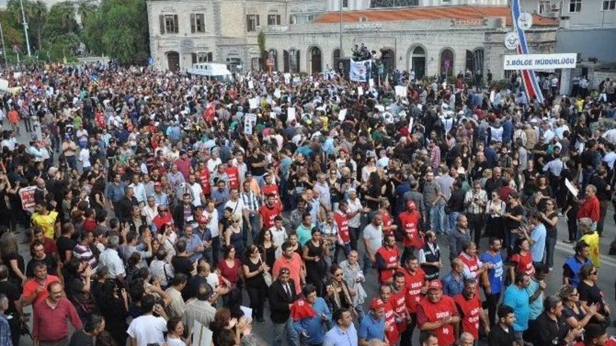 Ankara’daki patlamada hayatını kaybedenler için İzmir’de yürüyen 5 bin kişi, Alsancak Garı’nda anma töreni düzenledi.Bugün saat 12.30’da Gündoğdu Meydanı’nda toplanan DİSK, KESK, TMMOB, TTB ve diğer sivil toplum kuruluşu üyesi yaklaşık 5 bin kişi, Ankara’da meydana gelen patlamayı protesto için toplandı. Grup, slogan atarak Kıbrıs Şehitleri Caddesi üzerinden Alsancak Gar’a kadar yürüdü. Grup, Ankara’daki patlamada hayatını kaybedenlerin arasında 14 TCDD işçisi olduğu için Alsancak Garı’nda buluştu. Burada toplanan grup, Ankara’daki patlamada hayatını kaybedenler için anma düzenledi. Bu nedenle Alsancak Garı önüne çıkan Liman Caddesi, Atatürk Caddesi ve Şair Eşref Bulvarı ve ara sokaklar araç trafiğine polis ekiplerince kapatıldı. Gar önünde, patlamada hayatını kaybedenler için bir dakikalık saygı duruşunda bulunuldu. Sivil toplum kuruluşu yöneticileri konuşma yaparken, saldırılar kınandı.