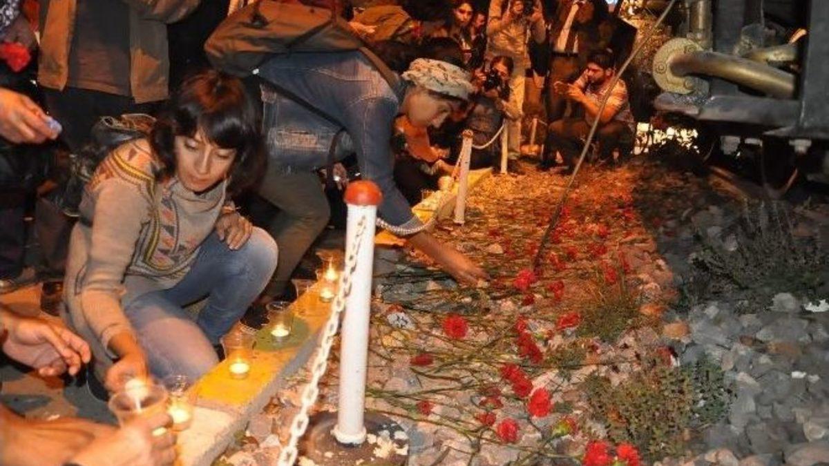 İzmir Alsancak Gar’ı önünde toplanan grup, Ankara’daki patlamada hayatını kaybedenleri yaktıkları mum ve karanfillerle andı.Ankara’da düzenlenen terör saldırısının ardından DİSK, KESK, TMMOB ve TTB’nin çağrısı üzerine yaklaşık 300 kişi, bugün saat 19.00’da Alsancak Garı önünde toplandı. Gruba, İzmir’de bulunan HDP Ağrı Milletvekili Leyla Zana da destek verdi. Grup, Alsancak Gar’ın önündeki nostalji trenin üzerine asılı, saldırıda hayatını kaybeden TCDD işçisi Birleşik Taşıma İş Sendikası üyesi 14 kişinin resimleri önünde mum yakıp, karanfil bıraktı. Daha sonra grubun içindeki kadınlar, sloganlar atarak yürüyüşe geçti. Kadınlardan oluşan grup, Kıbrıs Şehitleri Caddesi girişine kadar yürüyüp burada oturma eylemi yaptı. Yaklaşık yarım saat süren eylemden sonra grup olaysız bir şekilde dağıldı.