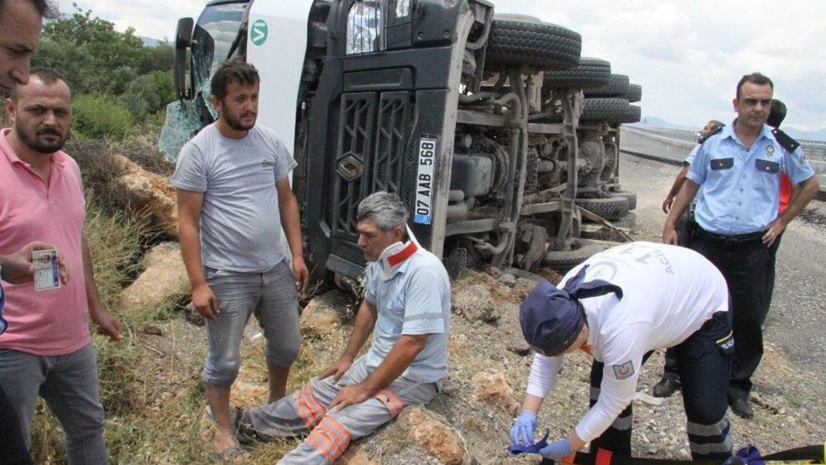Antalya’da beton mikserinin şarampole devrilmesi sonucu meydana gelen kazada sürücü yaralandı.Edinilen bilgiye göre kaza, saat 12.40 sırasında Antalya - Burdur Karayolu’nda TOKİ köprülü kavşağı yan yolda meydana geldi. Bir inşaata bıraktığı betonun ardından kent merkezine doğru dönüşe geçen Ali Güçlü idaresindeki 07 AAB 68 plakalı boş beton mikseri sürücüsünün direksiyon hakimiyetini kaybetmesi sonucu şarampole yan yattı. Yaklaşık 20 metre sürüklenen mikser, kenardaki taş ve toprak yığınlarına çarparak durdu. Kazayı görenler hemen durumu 112 Acil Çağrı Merkezine bildirdi.Kaza yerine itfaiye, polis ve sağlık ekipleri sevkedildi. Şoför bölümünde sıkışan sürücüsü polis ve vatandaşlar çıkardı. Ayak ve ellerinde kırıklar olduğu belirlenen sürücü Güçlü, 112 ekiplerinin ilk müdahalesinin ardından ambulansla Antalya Eğitim ve Araştırma Hastanesi’ne kaldırıldı. Polis kazayla ilgili inceleme başlattı.