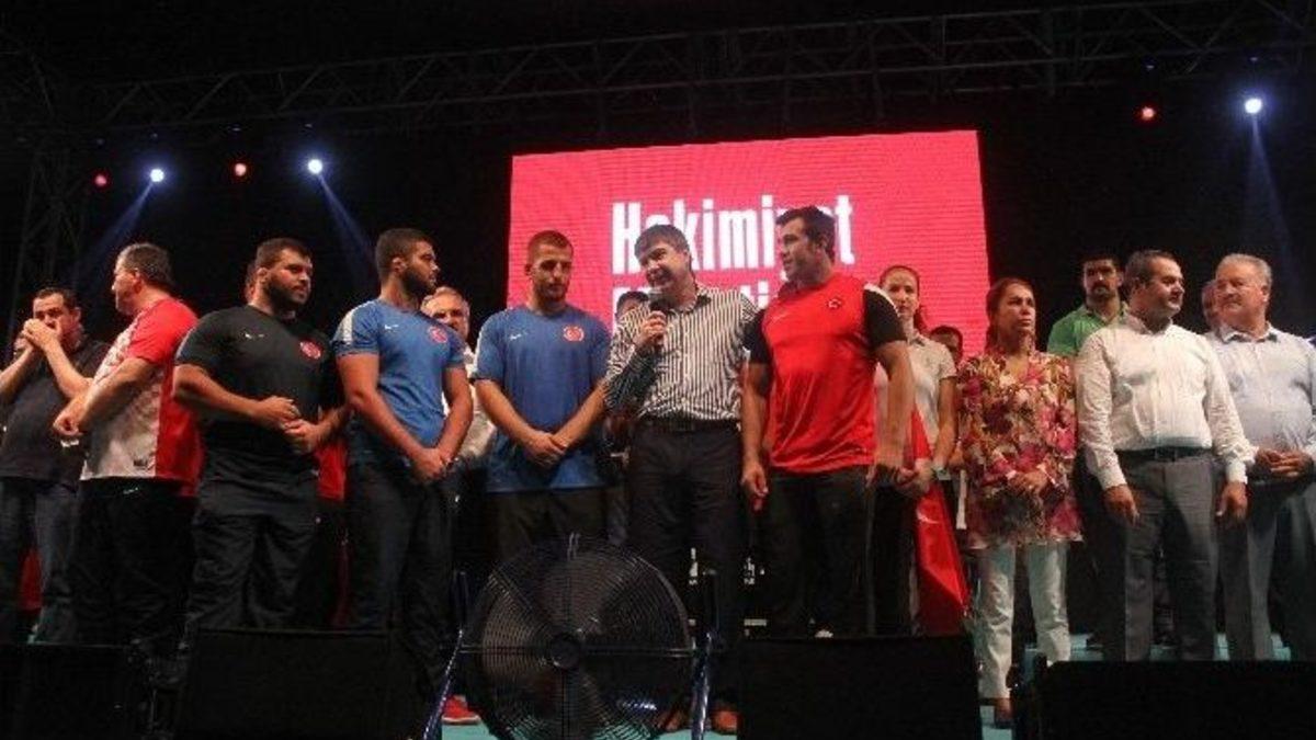 Antalya Cumhuriyet Meydanı’nda toplanan binlerce kişi, Fetullahçı Terör Örgütü’nün (FETÖ) darbe girişimine tepkilerini sürdürdü. Demokrasi nöbetine tarihi Edirne 655. Tarihi Kıkpınar Yağlı Güreşleri’nde ikinci olan Mehmet Yeşil, başpehlivan İsmail Balaban ve takım halinde birinciliğe uzanan ASAT Güreş takımı sporcuları da katıldı.Antalya’da, Cumhurbaşkanı Recep Tayyip Erdoğan ve Başbakan Binali Yıldırım’ın çağrısıyla 15 Temmuz gecesinden itibaren meydanları boş bırakmayan vatandaşlar "demokrasi nöbeti"ni sürdürdü. 30 derecelik sıcaklığın yüzde 90’lara varan nemle buluşmasıyla ortaya çıkan bunaltıcı havaya rağmen Antalyalılar Cumhuriyet Meydanı’na akın etti. Ellerinde Türk bayraklarıyla alanı doldura binlerce kişi darbe girişimine karşı sürdürülen, “ demokrasi nöbeti” ne devam etti.Nöbetin 15’inci gününde vatandaşlar, Cumhurbaşkanı Recep Tayyip Erdoğan’ın sesinden dinletilen şiirler, ilahiler eşliğinde nöbet beklerken, terör örgütü FETÖ’yü attıkları sloganlarla da tepki gösterdi."Protokol meydanları bırakmıyor”Demokrasi nöbetine ilk gün olduğu gibi yine, Antalya Valisi Münir Karaloğlu, Antalya Büyükşehir Belediye Başkanı Menderes Türel, AK Parti Antalya Milletvekili Gökçen Özdoğan Enç, AK Parti Antalya İl Başkanı Rıza Sümer ve çeşitli STK’ların temsilcileri de alanlardaydı.Demokrasi nöbetine tarihi Edirne 655. Tarihi Kıkpınar Yağlı Güreşleri’nde ikinci olan Mehmet Yeşil, başpehlivan İsmail Balaban ve takım halinde birinciliğe uzanan ASAT Güreş takımı sporcuları da katıldı."Pehlivanlara destek"Vali Karalioğlu,Türkiye’de pehlivan yetiştiren 5-6 destinasyonun olduğunu vurgulayarak, " Sadece bugün değil, tarihten bu yana pehlivan yetiştiren bölgeler var. Destek olmazsa bu pehlivanlarımızı koordine edecek güç olmazsa, bu pehlivanlar ortaya çıkamaz. Çayırda gidip şehrimizi temsil edemezler. Bu destek devam ettikçe hem minder de, hem çayırda bizler çok pehlivan alkışlarız" diye konuştu."Darbecilere,darbe yaptılar"Büyükşehir Belediye Başkanı Türel, Antalya Cumhuriyet Meydanı’nda demokrasi nöbeti’nde 15 günü geride bıraktıklarını belirterek, " Bu meydan günlerdir hiç eksilmeden nöbetine devam ediyor. Bu Antalya’nın büyüklüğünü gösteriyor, Antalya’nın demokrasiye bağlılığını gösteriyor. Bütün vatandaşlarımıza minnettarız. Güreş bizim ata sporumuz. Yağlı güreş önemli geleneksel sporumuzdur. İlk göreve geldiğim günden bu yana güreşe ayrı önem verdim. Dünün küçük sporcularımız bugün büyük başarılara imza attılar. Bu gençlerin geleceğine yatırım yaptığınız da her zaman Türk milletinin büyüklüğünü görüyoruz. Bu yiğitlerin mücadele ettiği çayırlar er meydanıdır. O meydandaki yiğitler, 15 Temmuz’da yine sahneye çıktı, darbecilere darbe yaptı. Ama korkaklar, hainler, alçaklar, zalimler, kaçacak delik aradı. Gitti, Yunanistan’dan medet umdu. Pensilvanya’dan medet umanlar en güzel dersi 15 Temmuz’da alacaklar. Bizler her zaman onların yanında altın kemerler alacağız. Başarılarla bilgeliklerle övüneceğiz. ASAT Güreş takımımız Kırkpınar’da takım halinde Türkiye birincisi oldu. Allah, er meydanlarındaki yiğit Antalyalılardan razı olsun" dedi.Öte yandan Antalya Halk Sağlığı Müdürlüğü FETÖ/PDY terör örgütü tarafından gerçekleştirilmeye kalkışılan darbe girişiminde, şehit düşen 245 kişi için helva dağıtımı gerçekleştirdi. Başta, Halk Sağlığı Müdürü Murat Özdemir olmak üzere, kurum çalışanları giydikleri ay yıldızlı tişörtlerle darbe girişimine tepki gösterdi.